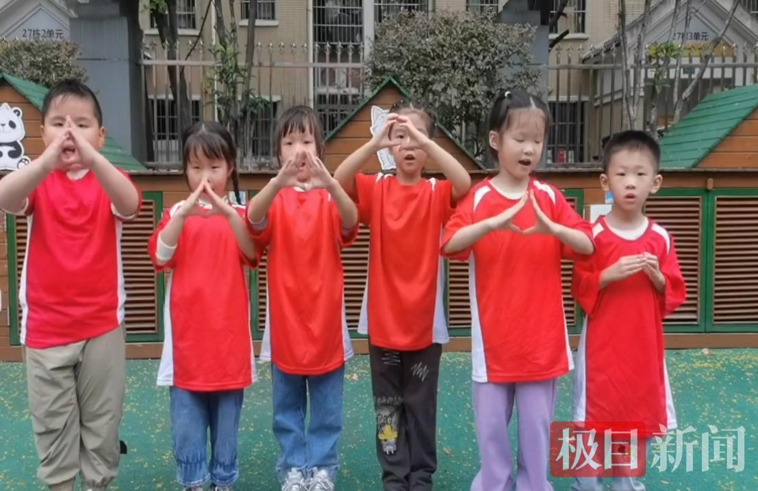“我们的名字叫中国,多幸运这里是我的国……”伴随着欢快的旋律响起,大班的小朋友们跳起动感的手势舞《名字叫中国》——小手一会儿比出“中国”的字形,一会儿像小鸟展翅般上下挥动,把对祖国妈妈的喜欢,融进了每一个蹦跳的动作和甜甜的笑里。