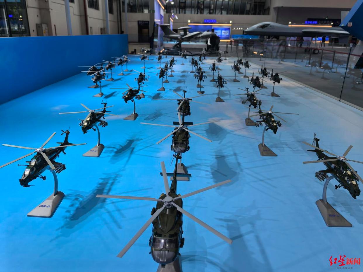 在国家成就与民族精神展板块,首先映入眼帘的是四架全尺寸飞机模型,分别是FC-31“鹘鹰”战斗机、翼龙无人机、直-10武装直升机、歼-15舰载战斗机。在它们的周围,围绕九三阅兵热点,展示了9大空中梯队模型。
