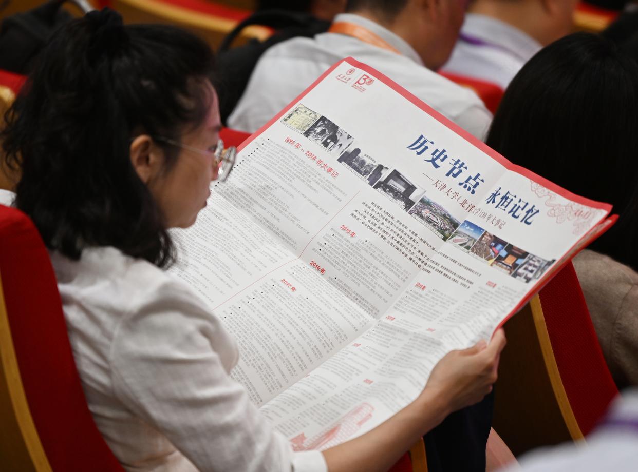 10月2日,与会者在翻阅天津大学校报。新华社记者 李然 摄