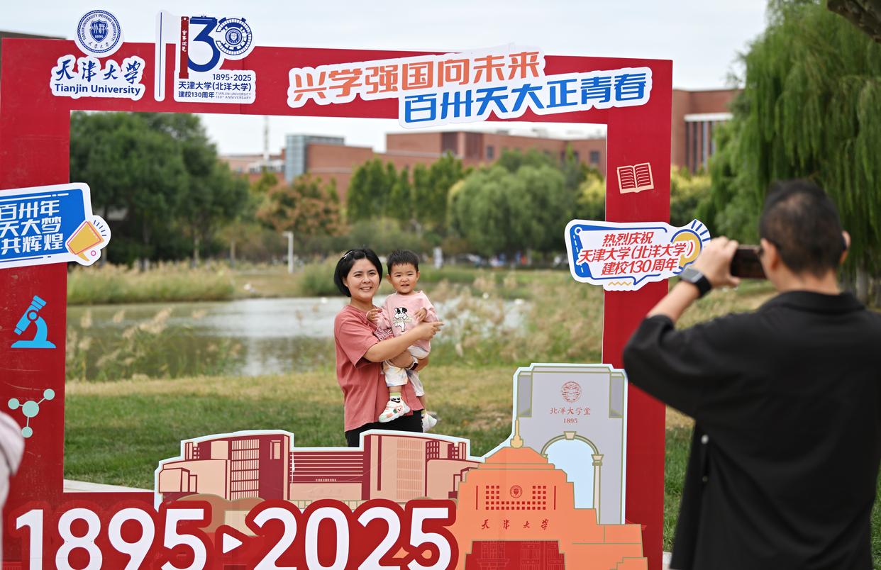 10月2日,天津大学校友带着孩子在北洋园校区留影。新华社记者 李然 摄