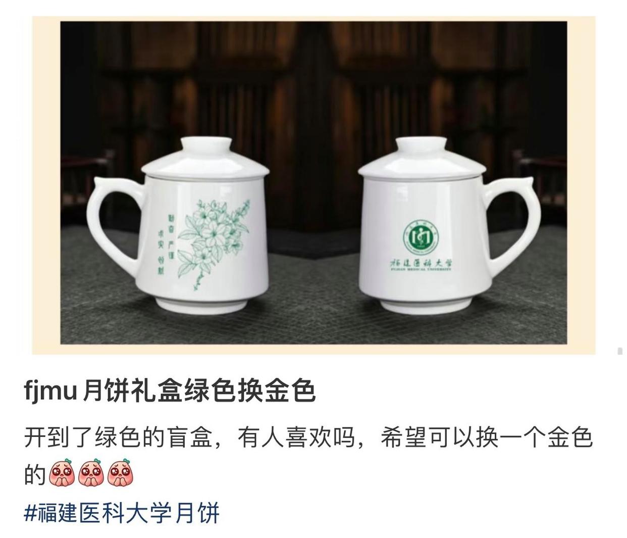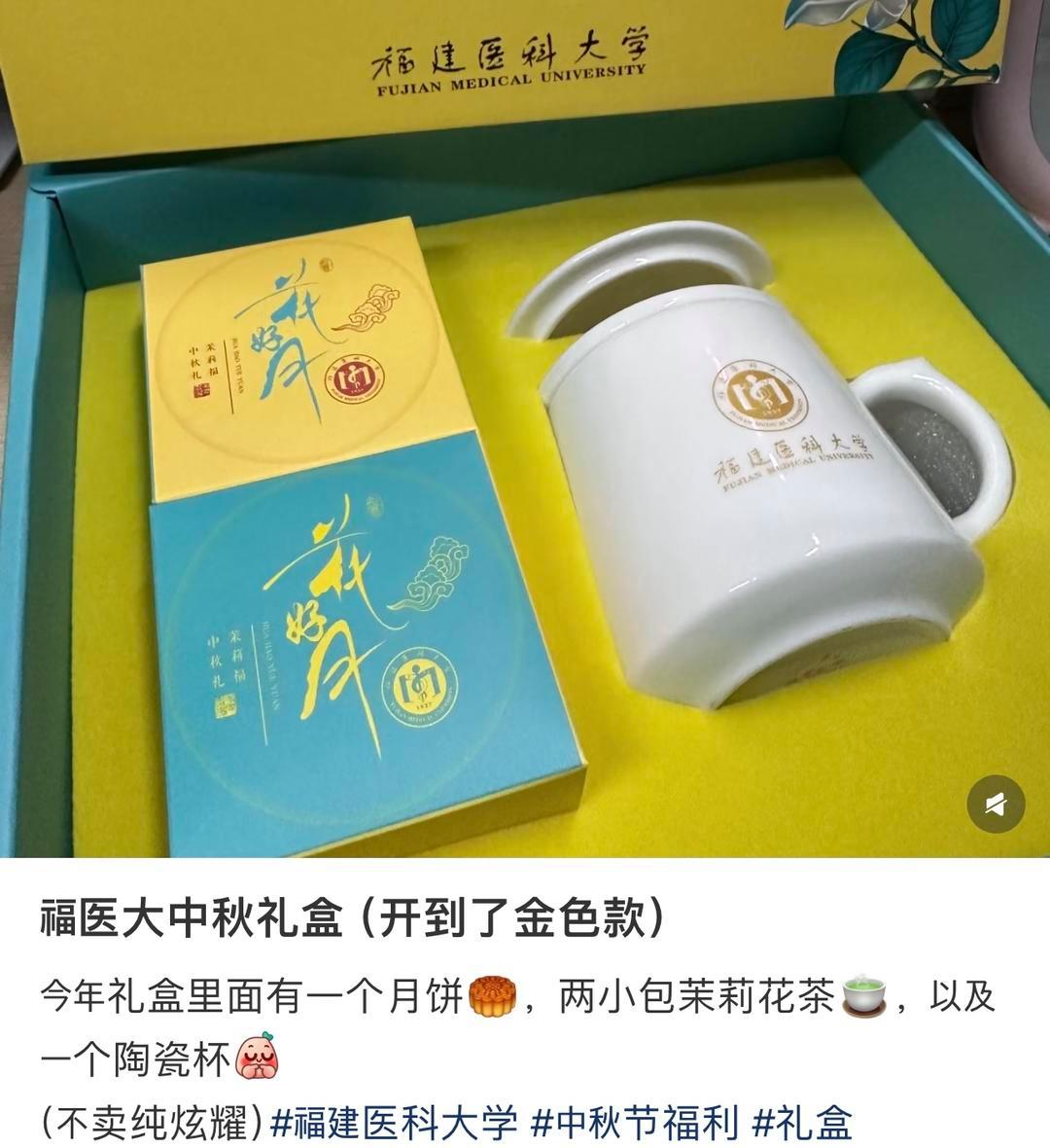 福建医科大学的“茉莉福·中秋礼”,也被学子们晒到了社交平台。礼盒里除了月饼和茉莉花茶,还有一款定制陶瓷杯,且杯子共有7种颜色,发放时随机分配。