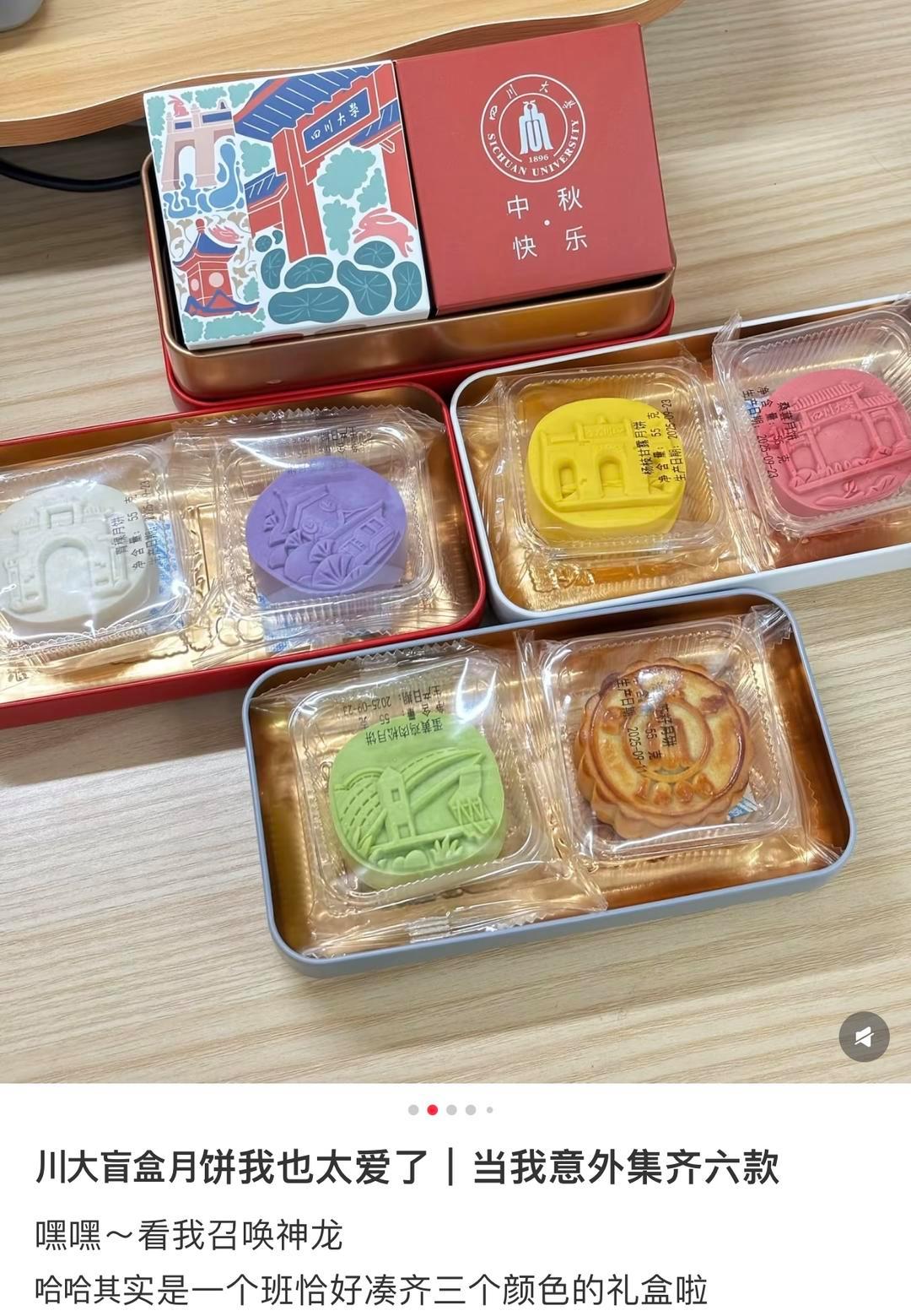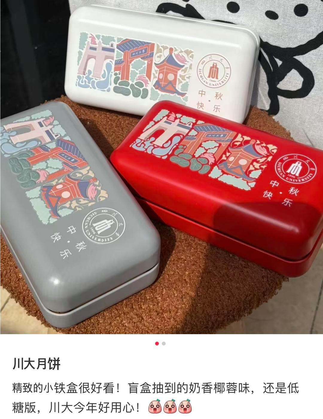 今年四川大学的中秋月饼全程随机派发,最让学子们称赞的,是月饼的铁盒包装——底色分红、白、灰三种,盒面上印着川大三个校区的标志性建筑,颜值与辨识度拉满。