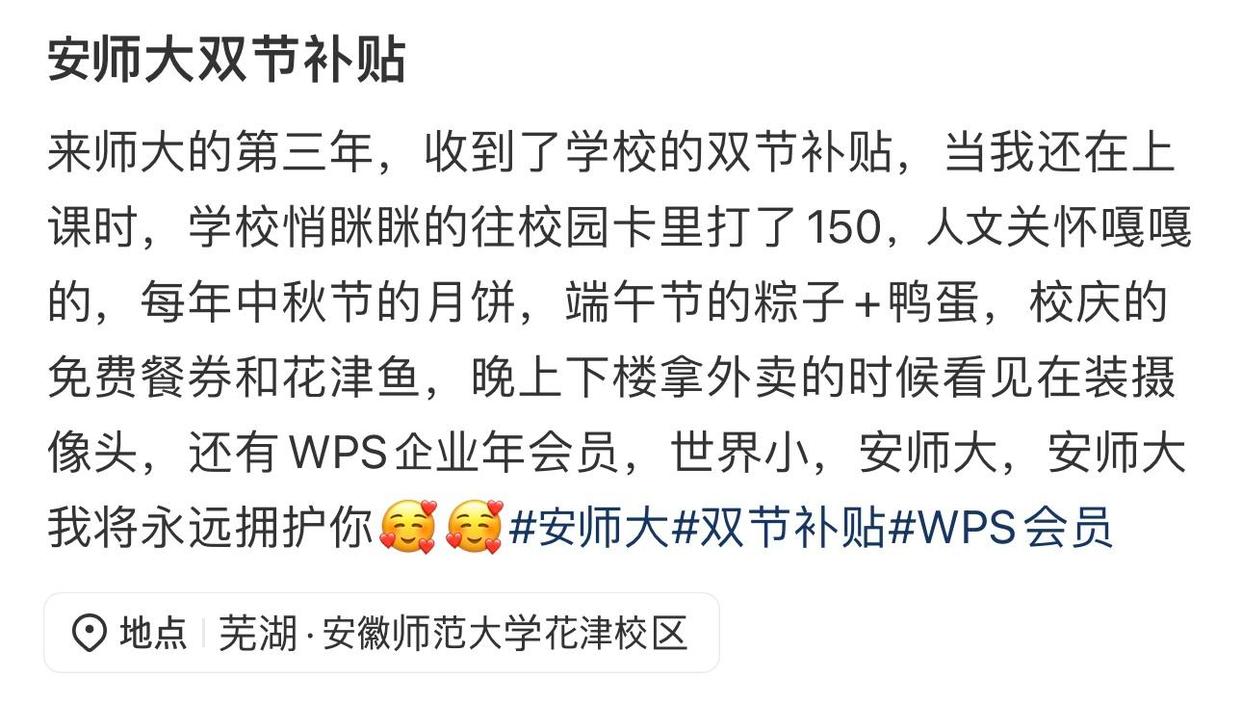 安徽师范大学的150元临时生活补贴,更是因“突然到账”,在学生的社交分享里刷屏。学子们纷纷晒出一卡通到账截图,称学校没提前通知,看到网上消息后查才发现福利到账。有人感慨“第一次收到学校的过节补贴,被狠狠‘宠’了”,还有学生直接发帖表白“安师大,我将永远拥护你”。