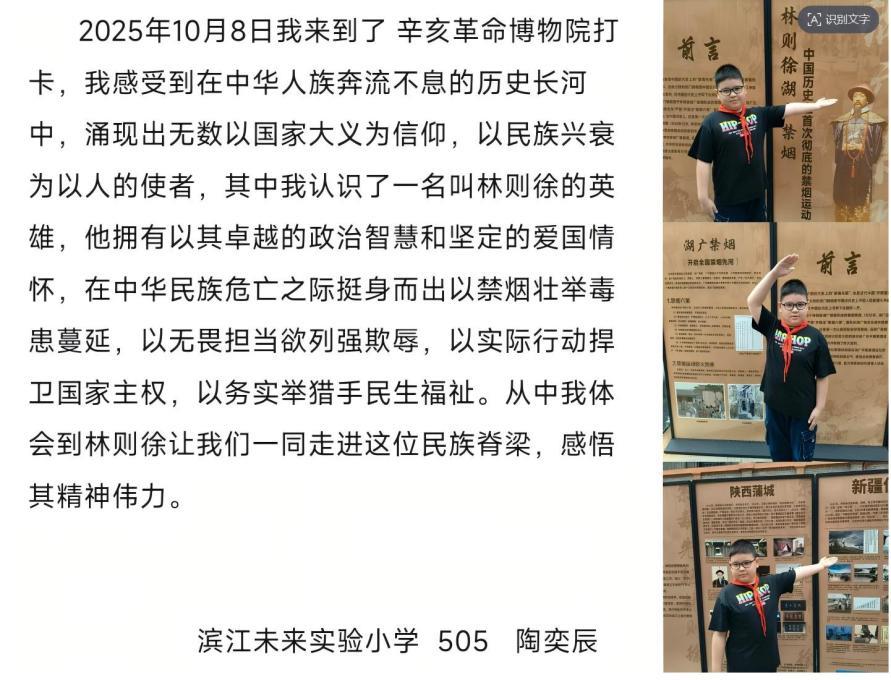 金秋十月,举国同庆。在这个充满荣耀与敬意的假期里,武汉市青山区滨江未来实验小学精心策划 “家校共育・行走的思政课” 主题活动,学生与家长走进辛亥革命博物院北院区,沉浸式参观 “林则徐湖广禁烟展”。这场跨越时空的历史对话,让孩子们在国庆氛围中触摸英雄足迹,在家校协同中播下禁毒种子,为假期赋予了别样的教育温度。