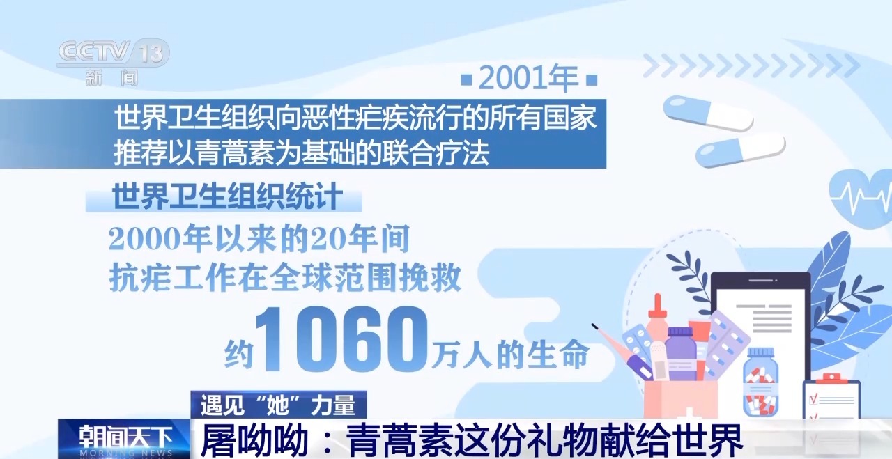 2001年,世界卫生组织向恶性疟疾流行的所有国家推荐以青蒿素为基础的联合疗法。世界卫生组织统计,2000年以来的20年间,抗疟工作在全球范围挽救了约1060万人的生命,而据不完全统计,自青蒿素问世以来,它已经在全世界治疗了数亿人。