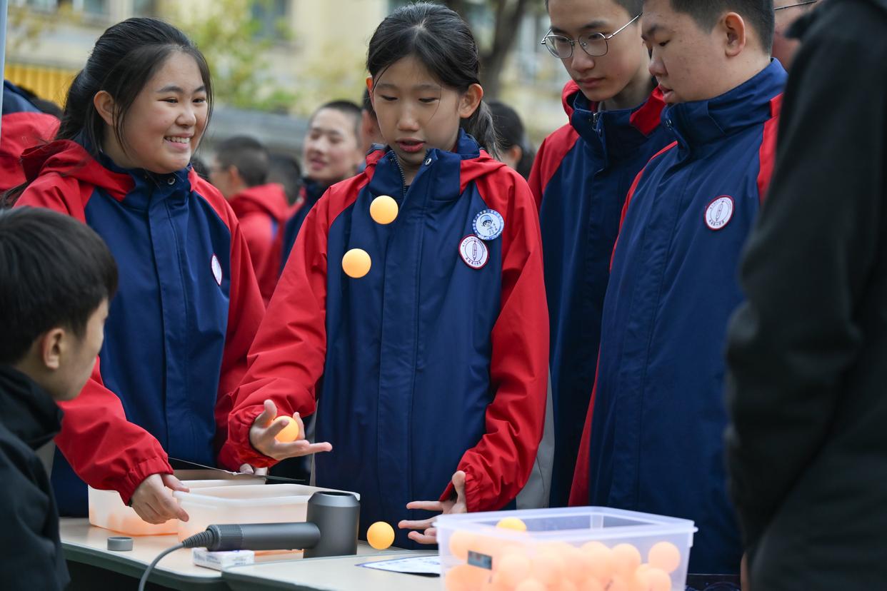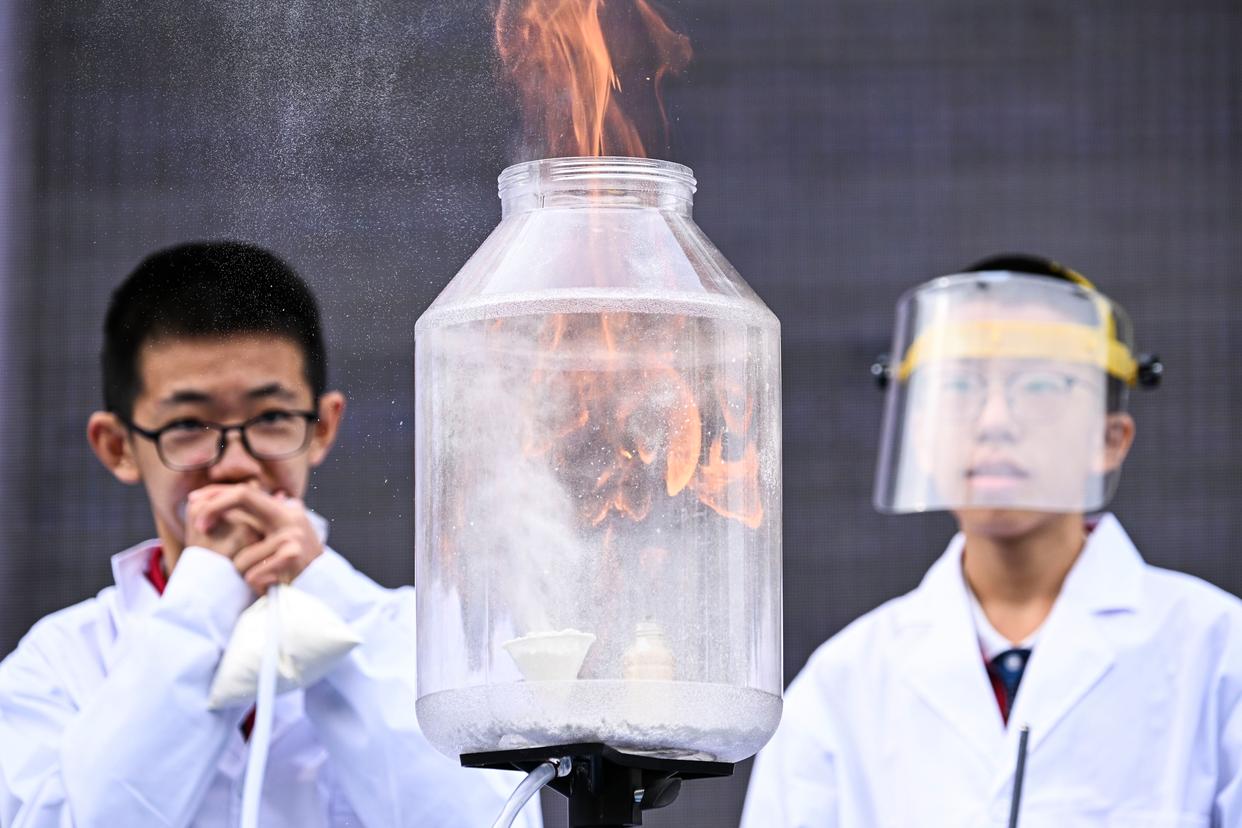 10月13日,新疆生产建设兵团第一中学学生在科技节开幕式上体验科学实验。新华社记者 王菲 摄