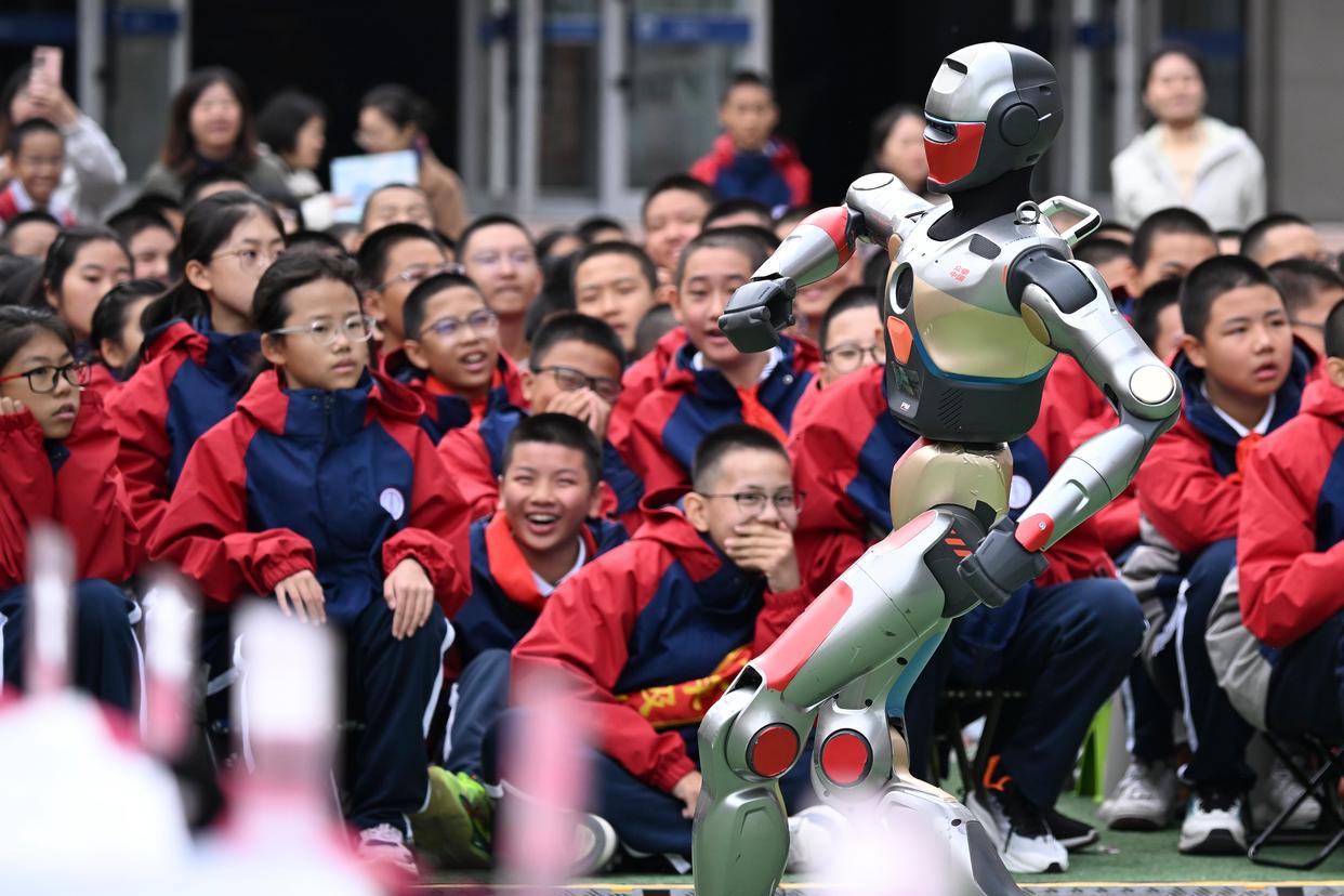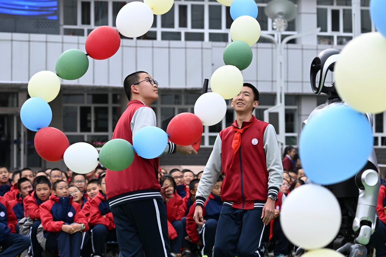10月13日,新疆生产建设兵团第一中学学生在科技节开幕式上观看智能机器人跳舞。新华社记者 王菲 摄