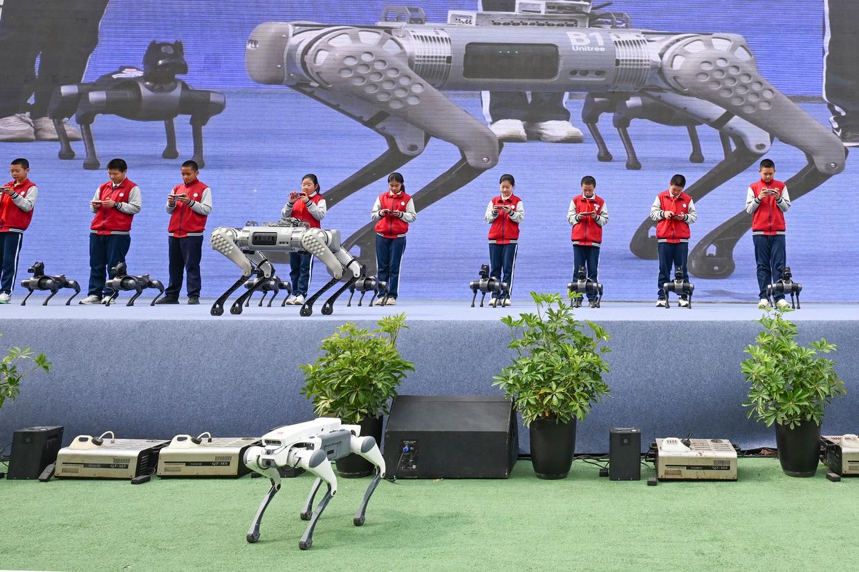 10月13日,新疆生产建设兵团第一中学学生在科技节开幕式上操控智能机器狗。新华社记者 王菲 摄