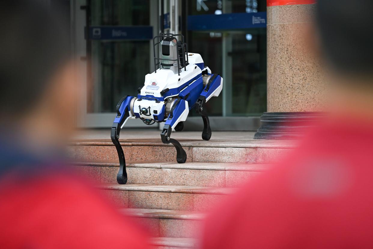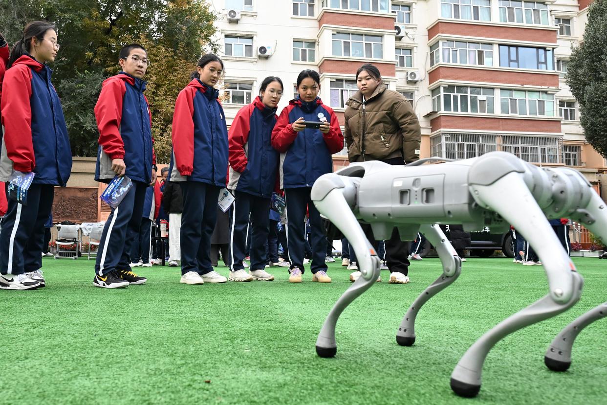 10月14日,新疆生产建设兵团第一中学学生观看智能机器狗进行复杂运动。新华社记者 王菲 摄