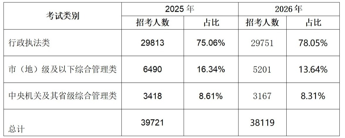 中公教育专家李茜分析,2026国考公共笔试科目延续了近年国考的分级分类模式, 公共科目笔试内容根据公务员应当具备的基本能力和不同职位类别、不同层级机关特点分为三类,分别适用于中央机关及其省级直属机构综合管理类职位、市(地)级及以下直属机构综合管理类职位和行政执法类职位。行政执法类职位突出测评依法办事、公共服务等方面能力,今年此类职位的招录体量再度荣登榜首,招录人数29751人,占总人数的78.05%。虽然人数比上年相比略有下降,但是占比增加,比去年提升了三个百分点,绝对性优势明显。