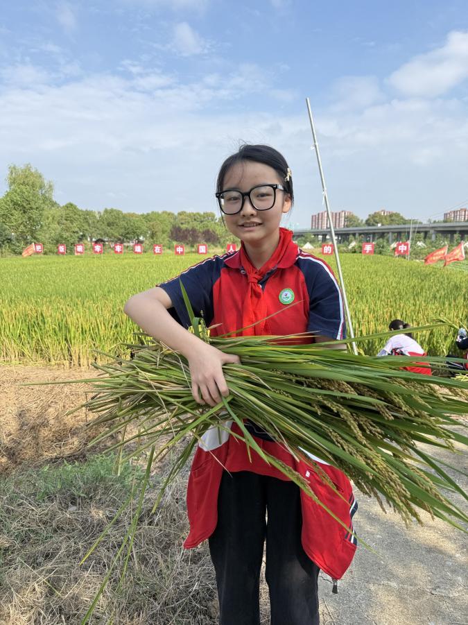 随着活动推进,孩子们越发熟练。稻田中央,一名女生抱起一束她收割的稻穗向大家展示着劳动成果,周围同伴纷纷欢呼响应。大家互相鼓劲,将一束束收割的稻穗在木筐上用力地磕打着,让那些成熟的稻米脱落到木框中,田间洋溢着协作的温暖。带队老师表示:“孩子们不仅学会了农具使用,更懂得了珍惜粮食的意义。”