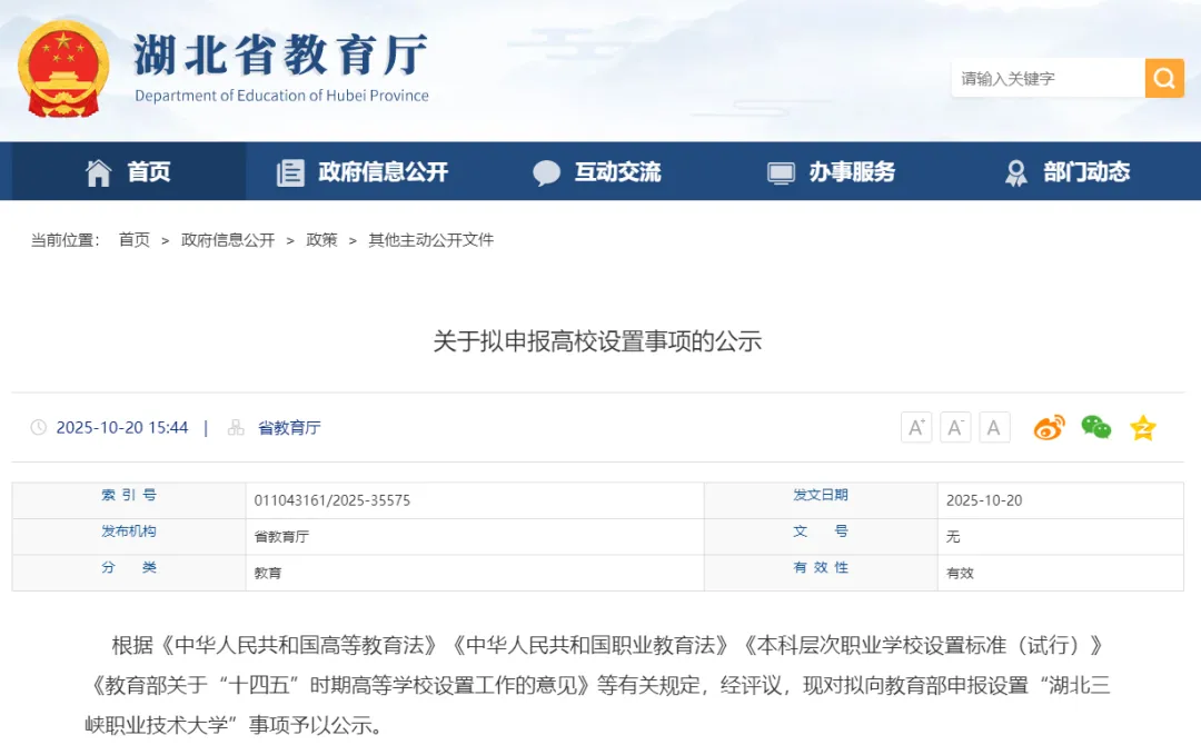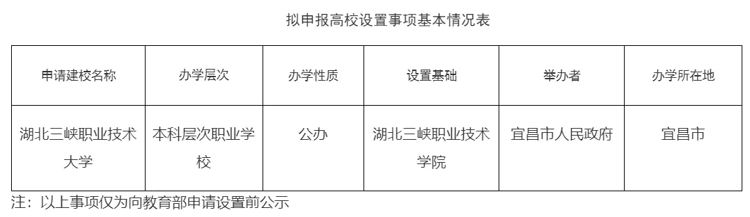 根据《中华人民共和国高等教育法》《中华人民共和国职业教育法》《本科层次职业学校设置标准(试行)》《教育部关于“十四五”时期高等学校设置工作的意见》等有关规定,经评议,现对拟向教育部申报设置“湖北三峡职业技术大学”事项予以公示。