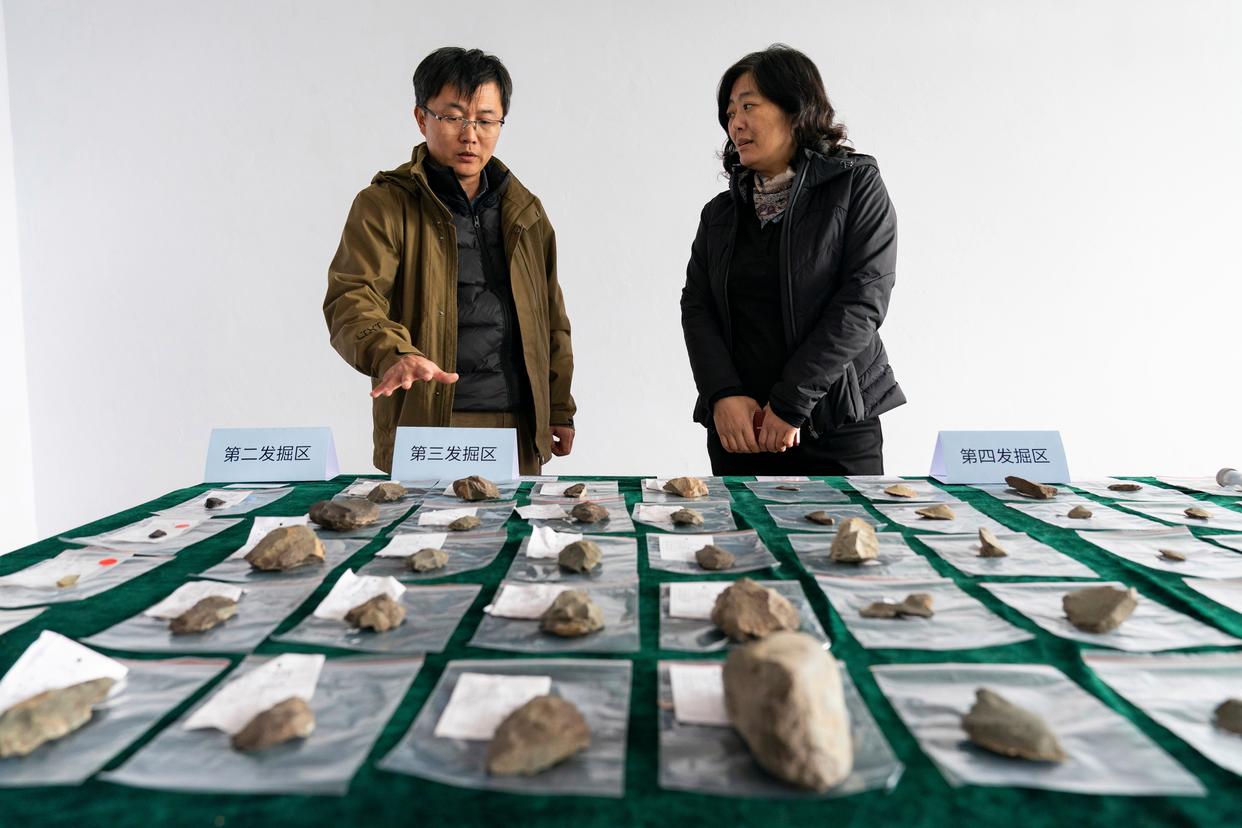 10月20日,在海林市石河村,黑龙江省文物考古研究所副所长、石人洞考古发掘项目负责人李有骞(左)向山东大学考古学院院长、教授王芬介绍石人洞遗址中发掘出的石器。新华社记者 谢剑飞 摄