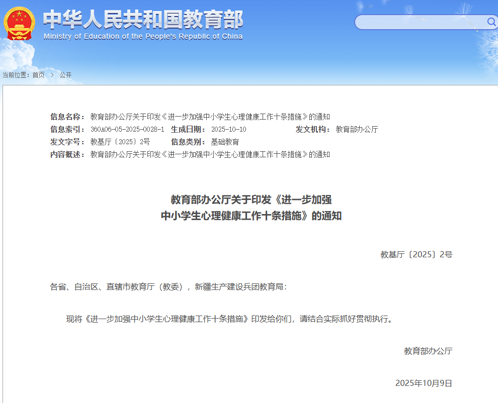 近日,教育部印发通知,出台《进一步加强中小学生心理健康工作十条措施》。