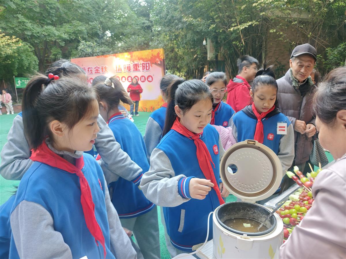 节目表演结束后,最温馨的互动环节正式开启。同学们与爷爷奶奶们围坐在一起,共同体验糖葫芦制作——去核、串果、裹糖,一双双小手与一双双老手相互配合,晶莹剔透的糖衣裹着鲜红的山楂,酸甜的香气弥漫在空气中,也串起了老少之间的温情。随后,同学们小心翼翼地捧着切好的蛋糕,走到坐轮椅的老人身边,将甜蜜的蛋糕递到老人手中。最后,全体同学齐声送上真挚祝福:“祝爷爷奶奶们,身体健康,重阳节快乐!”简单的话语、真诚的笑脸,让老人们倍感温暖,不少老人眼中泛起了感动的泪花。