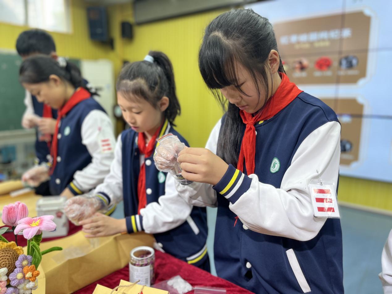 “独在异乡为异客,每逢佳节倍思亲。”504班的左一诺同学一边制作花茶包,一边吟诵课本上学过的重阳节经典诗句。“我爷爷也喜欢喝菊花茶,上次我感冒,他还给我煮了菊花红枣水,说喝了能舒服点。”孩子们把对老人的牵挂、对传统节日的理解,都细细密密地包进了这一个个小小的花茶包里,让每一份礼物都承载着最纯真的爱意。