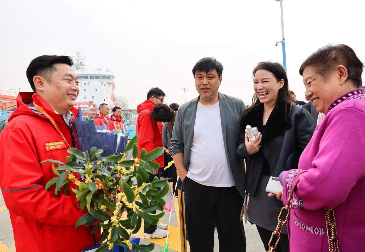 11月1日,科考队员手持家人赠送的桂花枝条与他们话别。新华社记者 方喆 摄