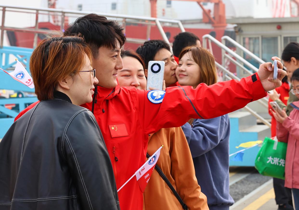 11月1日,科考队员在码头上与家人亲朋合影话别。新华社记者 方喆 摄