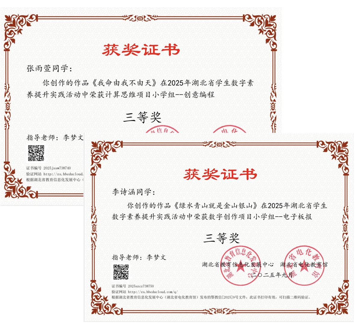 编程学习带来的改变,正悄然在孩子身上显现。五年级学生熊思贤说:“学编程后,我的数学解题思路更清晰,成绩也提高了。”六年级的张雨萱则兴奋地分享道:“每次解决一个Bug,就像当了一回神探,特别有成就感!”更多的自信,源于他们亲手设计的作品赢得老师赞誉,在省、市、区级编程比赛中屡获佳绩——那份“我能行”的自我肯定,正点亮他们前行的道路。