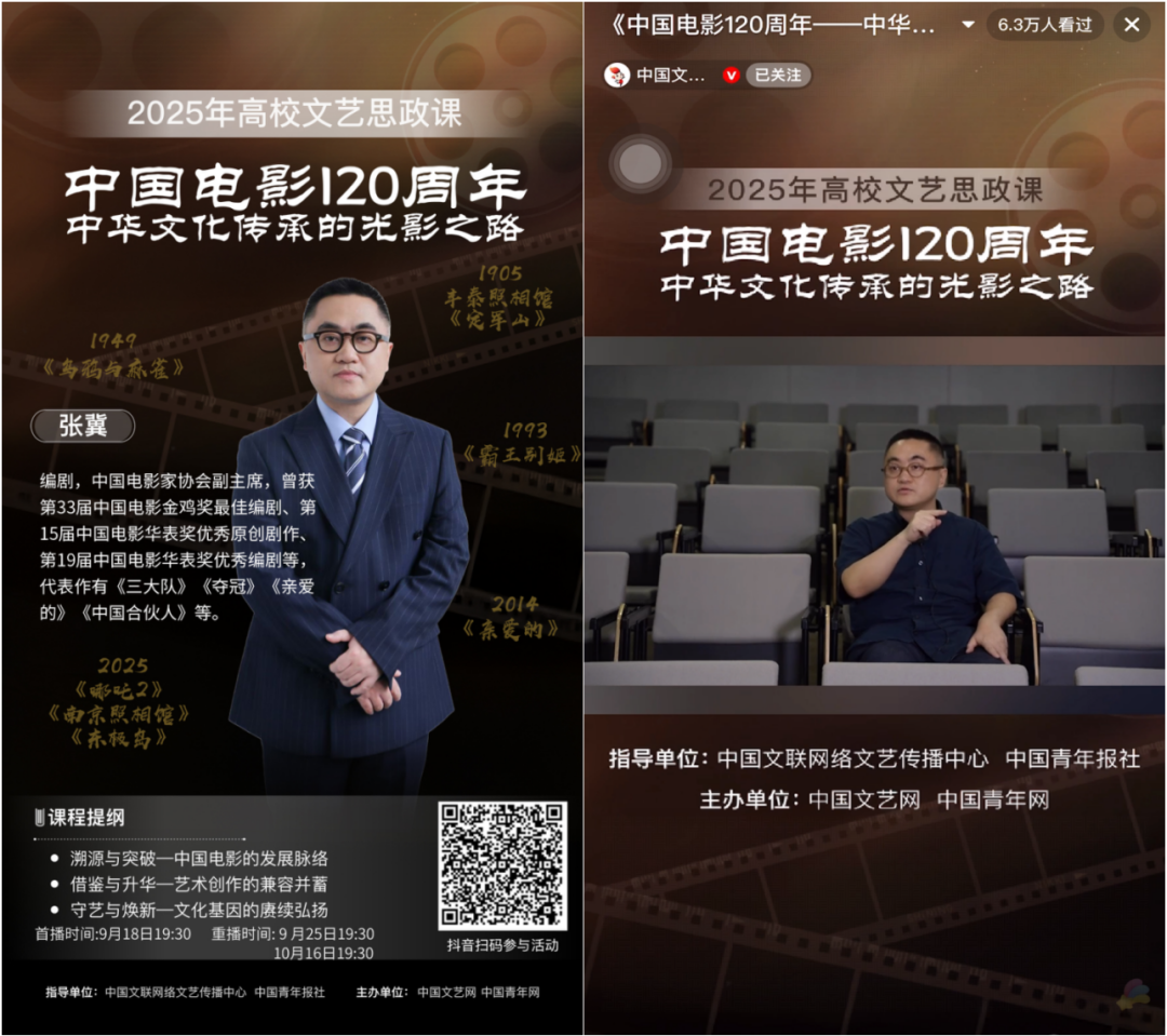 《中国电影120周年——中华文化传承的光影之路》直播课程,以中国电影诞生120周年为契机,回顾中国电影的发展历程。张冀以《定军山》为起点,讲述了早期国产片在好莱坞垄断背景下,依托传统文化实现突破创新的历程;深入解析“传统文化取材”与“现实主义创作”两条核心脉络,以及不同时期中国电影的学习与开放之路。