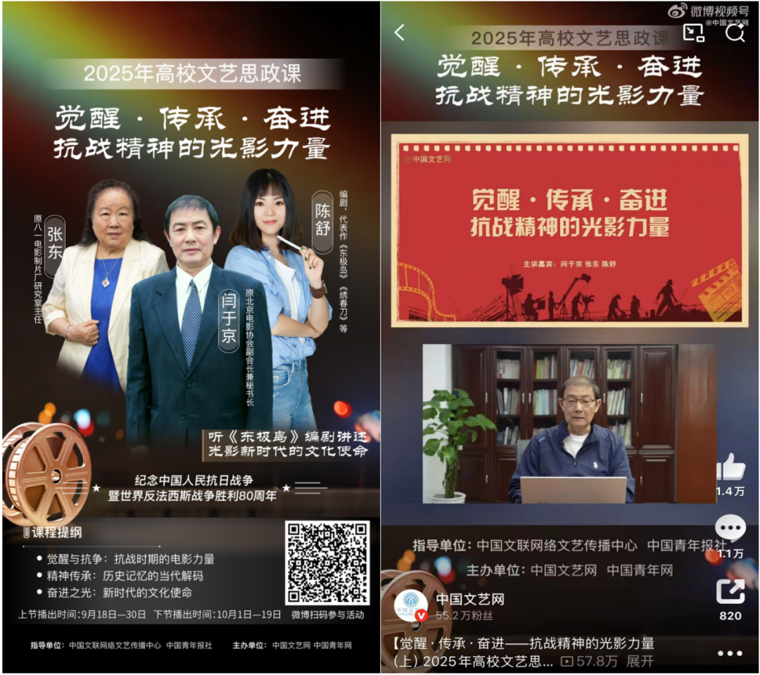 《觉醒?传承?奋进——抗战精神的光影力量》视频课程,选取了抗战时期、新中国成立后及新时代三个历史阶段的多部代表性经典影片(包括《风云儿女》《地道战》《东极岛》等),并对其进行深度解读与赏析。闫于京、张东及陈舒分别从时代背景、创作历程、艺术手法等维度,剖析这些文艺作品所蕴含的民族精神。