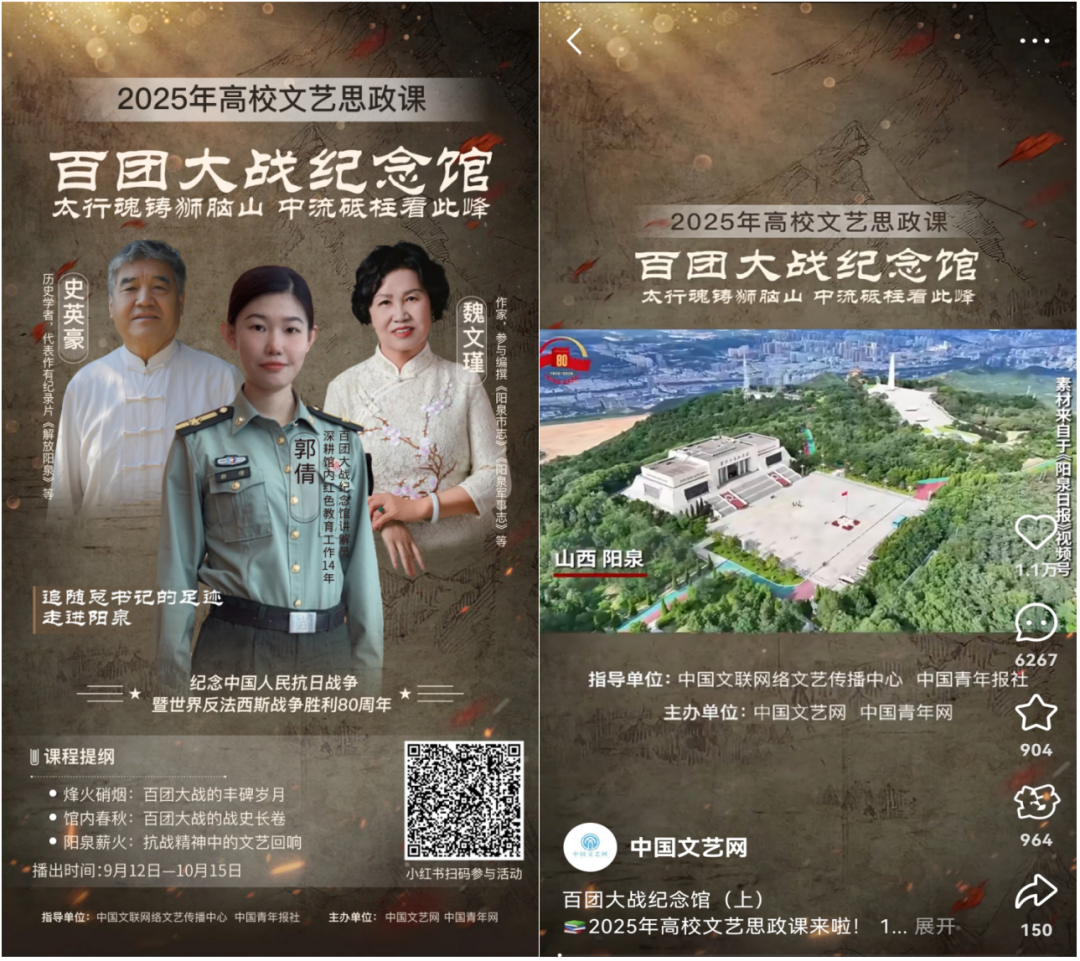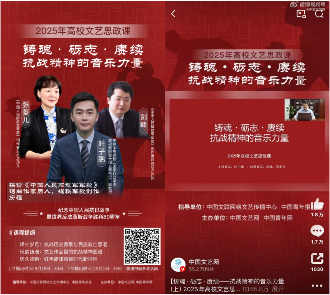 为纪念中国人民抗日战争暨世界反法西斯战争胜利80周年,今年9月至10月,在中国文联网络文艺传播中心和中国青年报社的指导下,中国文艺网与中国青年网共同开展了“弘扬抗战精神,传承优秀文化”2025年高校文艺思政课公益活动。相关内容在中国文艺网官方抖音账号“@中国文联小艺”、小红书账号“@中国文艺网”及微博账号“@中国文艺网”以直播或视频形式呈现。