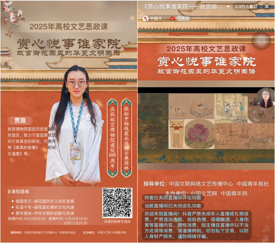 今年正值故宫博物院建院100周年,北京中轴线申遗成功一周年。《赏心悦事谁家院——故宫御花园里的华夏文明图谱》直播课程围绕故宫御花园石景展开。贾薇为学生解析园林美学,梳理御花园历史沿革,探寻假山石景承载的六百年皇家营造技艺与中华传统文化,以此展现文化遗产保护的重要性。课程深入挖掘文化内涵,以堆秀山、养性斋等重点区域石景为例,解读其背后蕴含的造景理念与历代审美意趣。