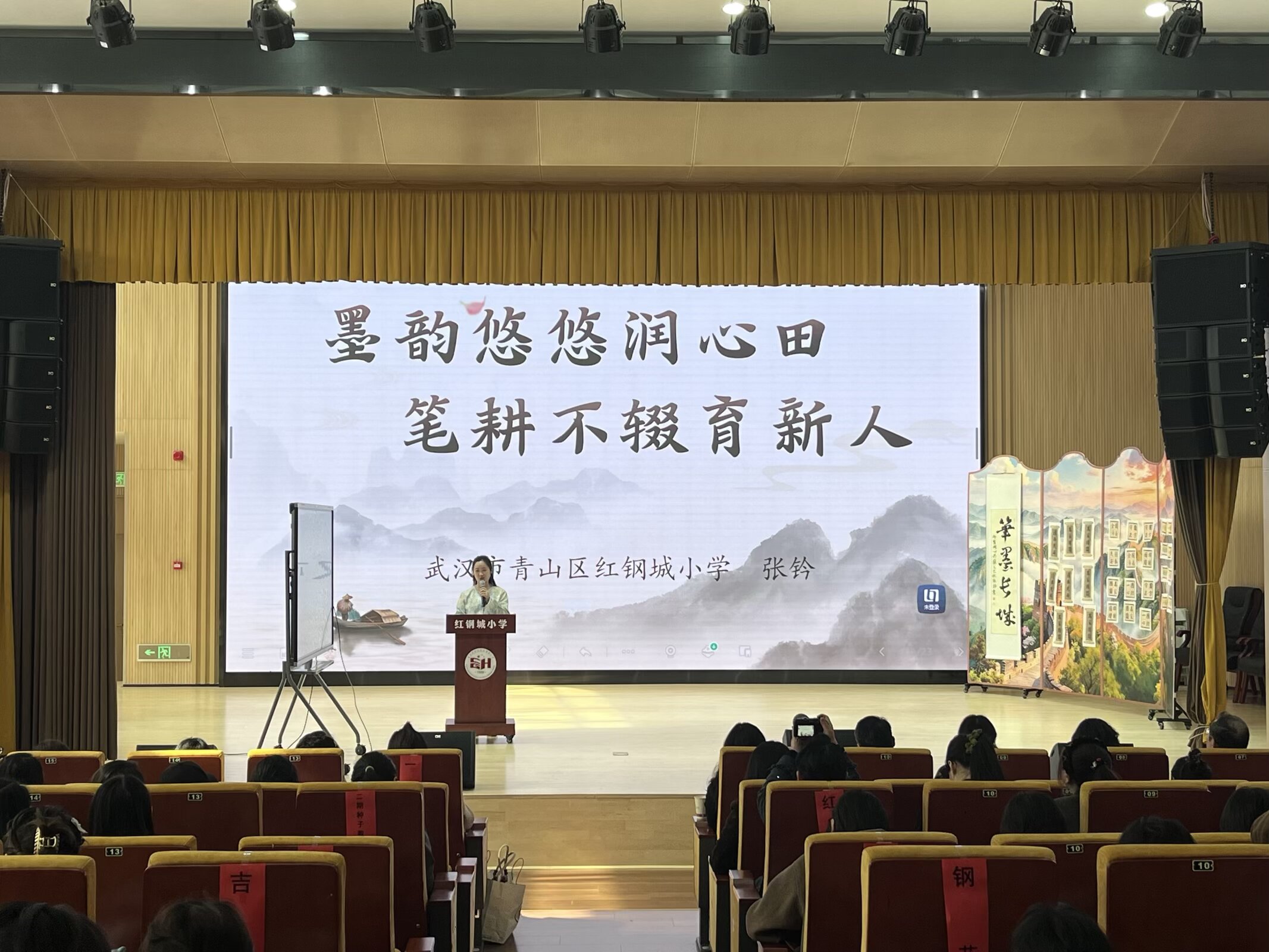 “写好方框字,读懂一座城,做方正中国人!”9时30分,四楼报告厅里,红钢城小学教师张钤的书法课《方框》让与会者眼前一亮。作为武汉市书法种子教师研修班优秀学员,她以“笔墨筑长城”为引,把汉字结构“方圆之美”与古人“天圆地方”的时空概念相融合,将“智圆行方”的精神渗透在书法课堂之中。