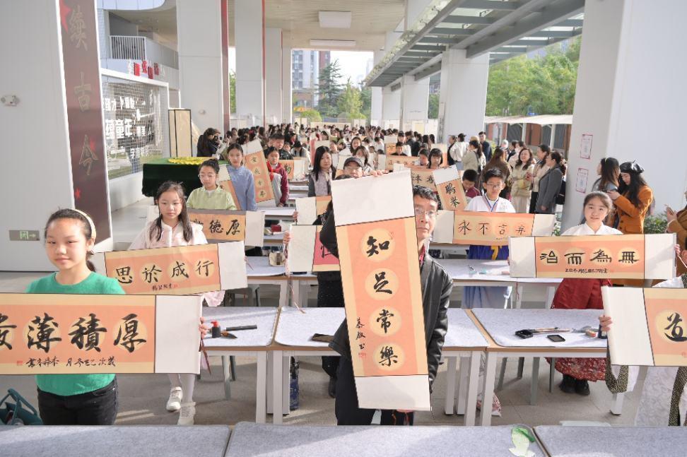 随后,40名教师与60名学生组成的书写方阵,静坐凝神、挥毫泼墨。老师们笔力遒劲,起笔落笔皆是岁月沉淀;同学们眼神发亮,稚嫩笔触满是对汉字的热爱。“墨韵传薪”“上善若水”等寓意深远的词句跃然纸上,无人机低空掠过,将这壮阔场景定格成最美的文化画卷。书写结束后,百卷齐展墨香四溢,现场赞叹声此起彼伏。