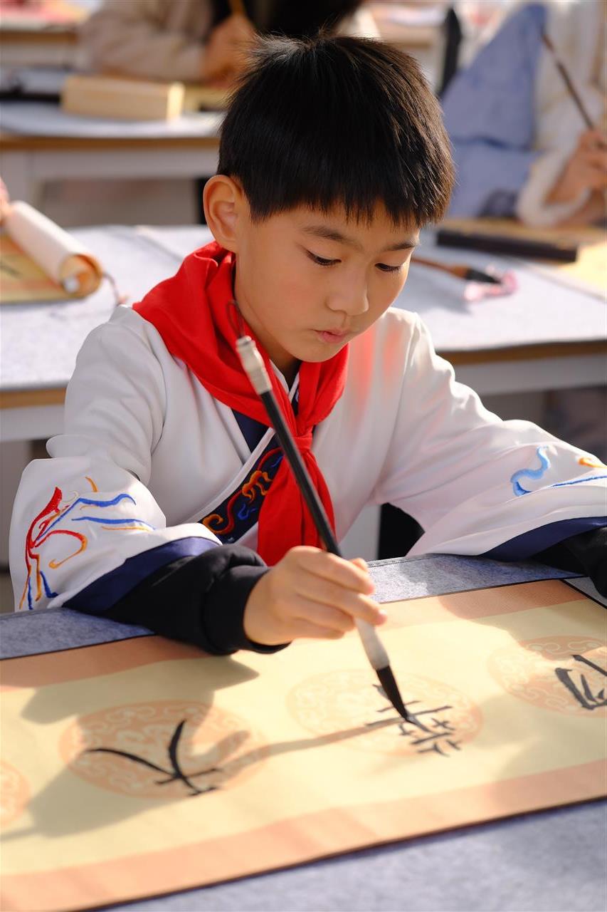“这笔锋太酷了!和老师一起写书法,比上体育课还让人激动!”11月11日上午,青山区红钢城小学(建五校区)里,身着中式服装的同学们握着毛笔兴奋地欢呼。一场以“笔润青山・墨韵传薪”为主题的书法教学展示活动在这里热闹开启,全区20所学校的上百名教育工作者与师生们一道,用笔墨共赴传统文化之约。