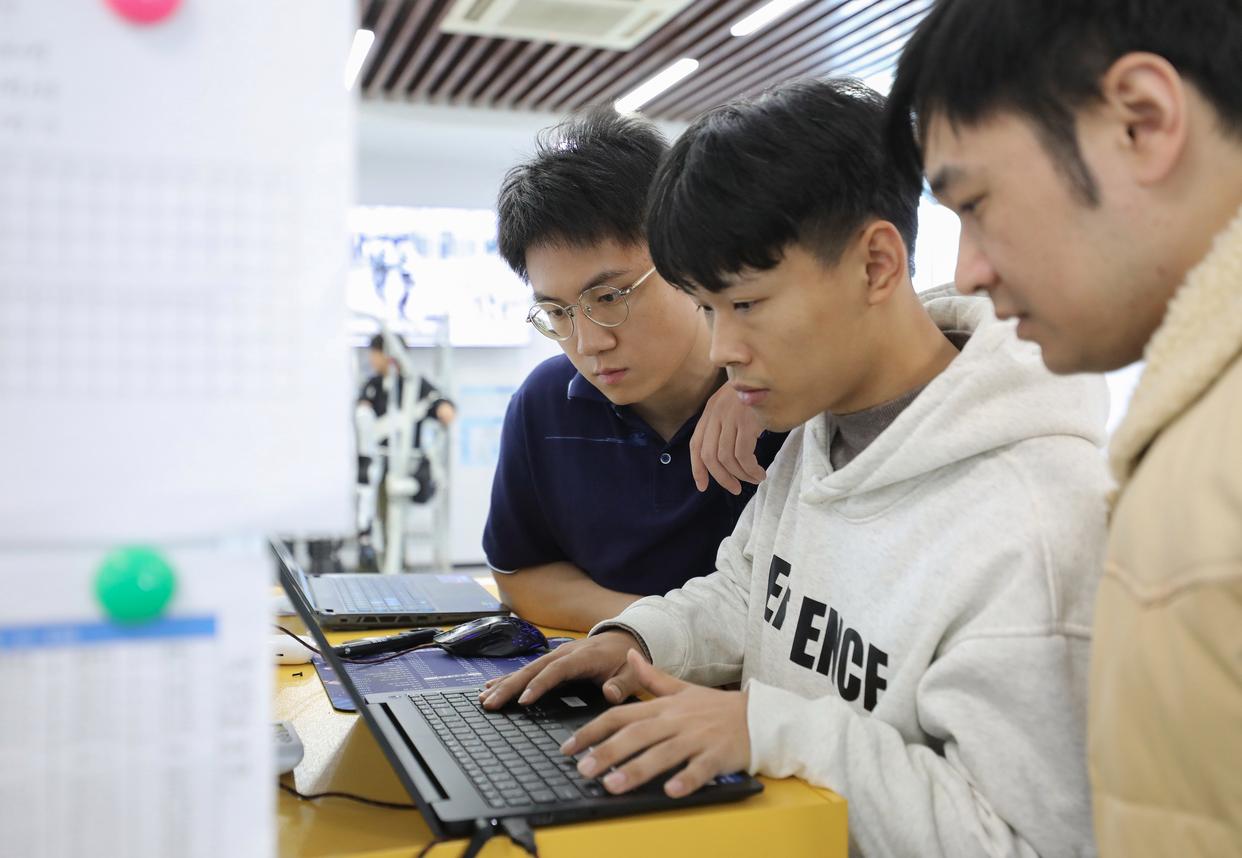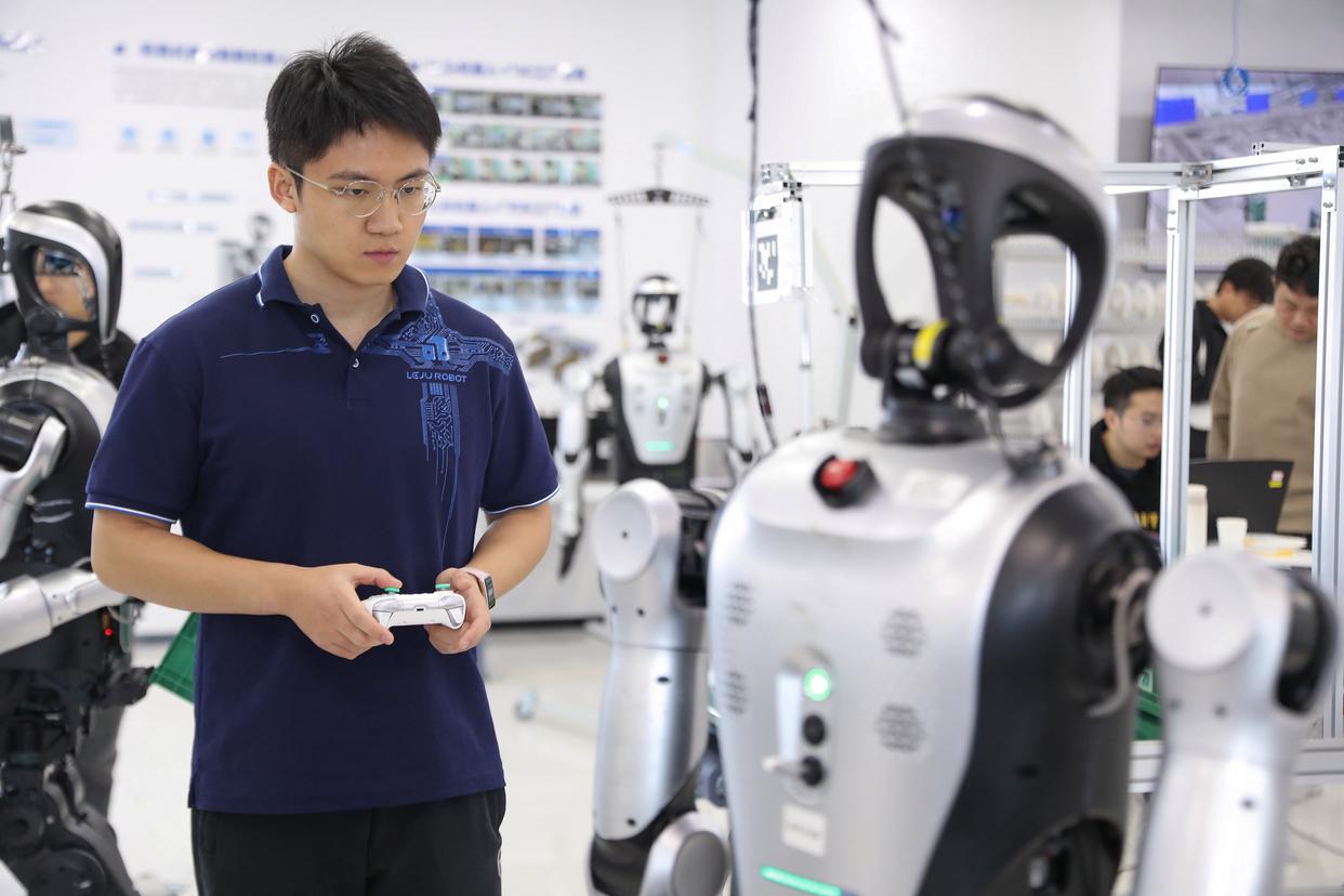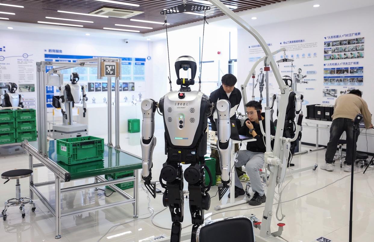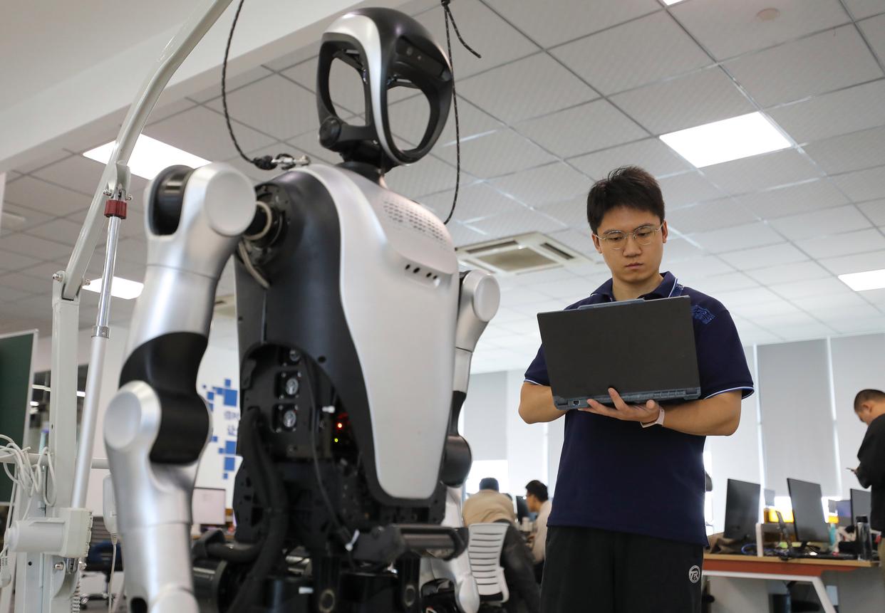 在合肥乐聚机器人技术有限公司,工作人员查看人形机器人的测试数据。社会的发展与政策的支持