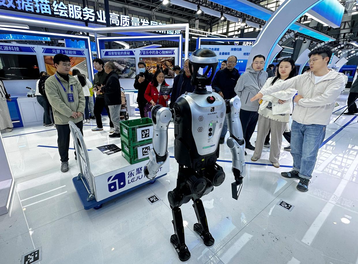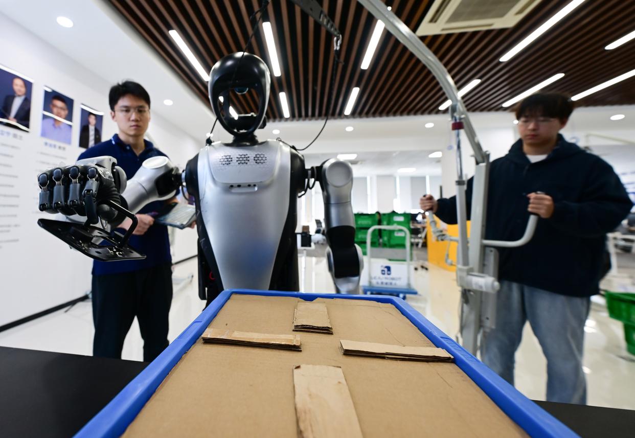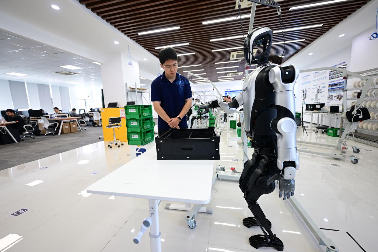 在合肥乐聚机器人技术有限公司,工作人员查看人形机器人的测试数据。社会的发展与政策的支持