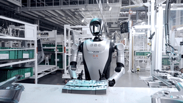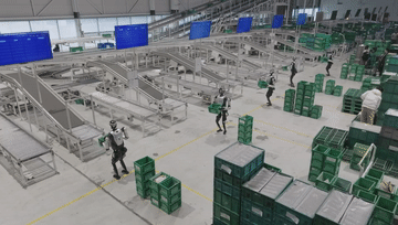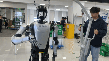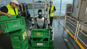 “夸父”人形机器人在工厂进行实地测试,搬运塑料箱。张鸿伟介绍