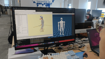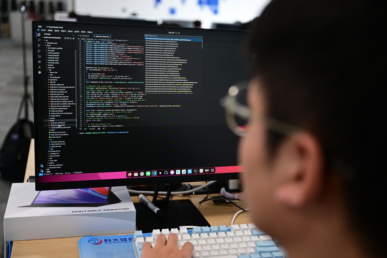 张鸿伟查看电脑上人形机器人的运行数据。人形机器人面对不同的“工作要求”