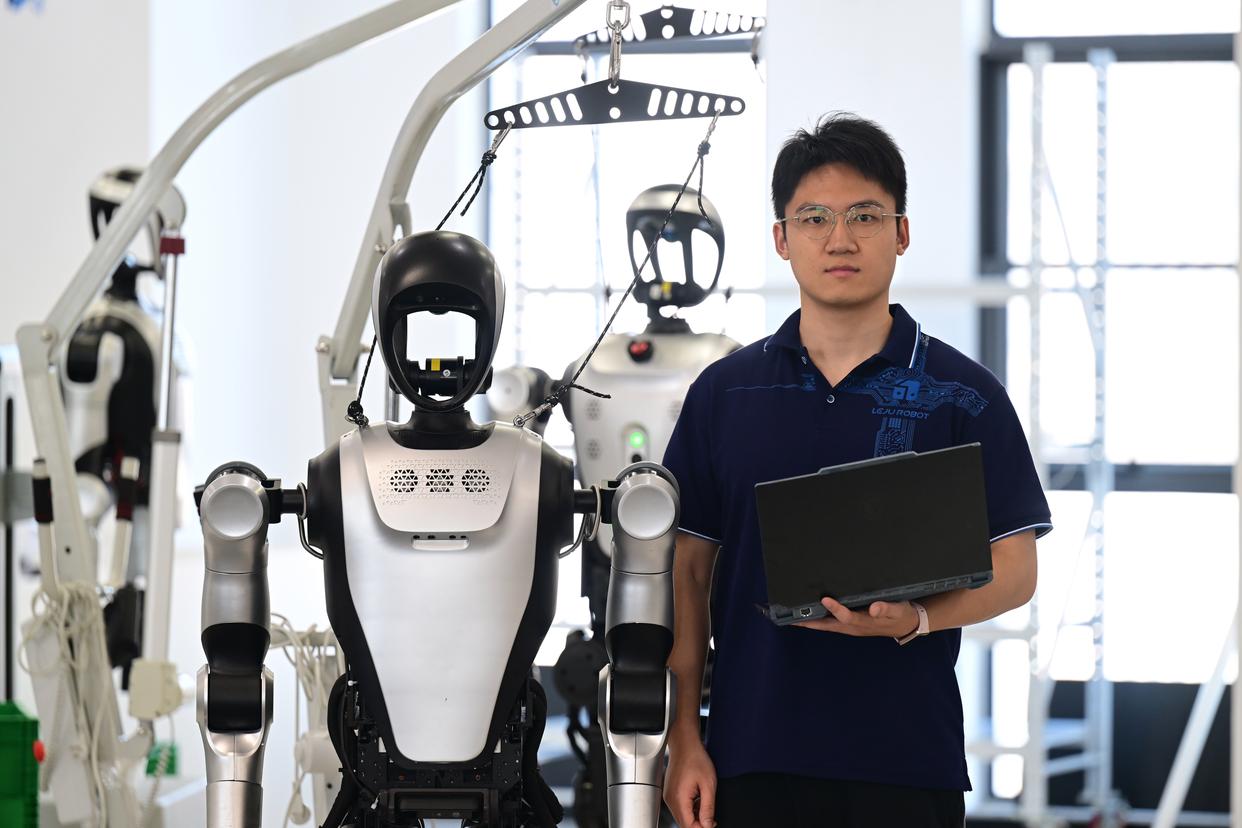 张鸿伟给人形机器人安装电池,准备进行测试。张鸿伟所在团队正训练机器人