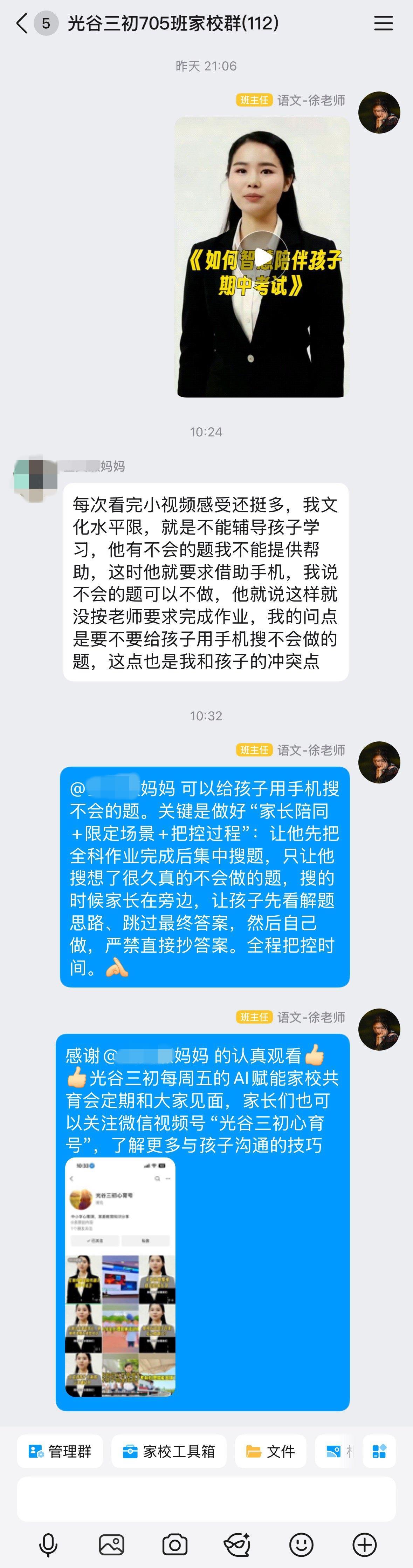 11月21日晚,在有约2100名学生的武汉市光谷第三初级中学(下文简称“光谷三初”),44个班均在班级家校群中推送了最新一期“周五有约”心理微课,这次的视频时长3分39秒,主题是“感恩节,除了说‘谢谢’,我们还能给孩子什么”。上两期则是“如何智慧陪伴孩子期中考试”“期中考后,家长该如何和孩子聊成绩”。