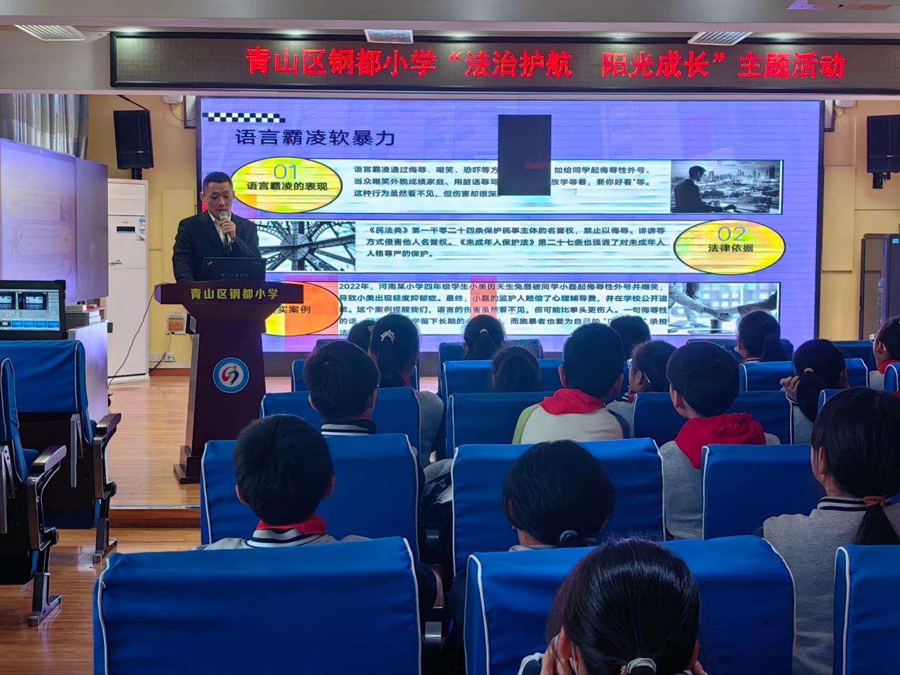 11月27日,武汉市青山区钢都小学举办了一场以“法治护航 阳光成长”为主题的法治宣传教育活动。学校特别邀请学校法治副校长、青山法院法官助理孙龙作为主讲嘉宾,为四至六年级学生带来了一场生动且深刻的法律知识盛宴。
