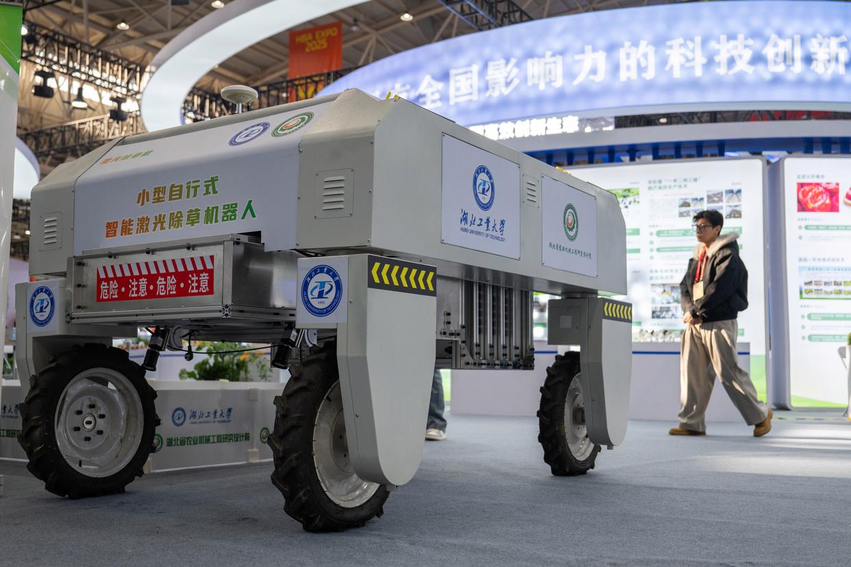 11月29日,2025湖北农业博览会展出的智能激光除草机器人。新华社记者 杜子璇 摄 绿色发展是农业高质量发展的鲜明底色。在绿色农业展区,武汉梵承新材料有限公司负责人左大军正向前来参展的种粮大户科普:“传统塑料农膜若不及时清理,不仅造成白色污染,长期积累还可能引发土壤次生盐碱化,影响耕地质量。”展台上,这家公司自主研发的农膜、育秧盘、粘虫板等新型农资整齐陈列。