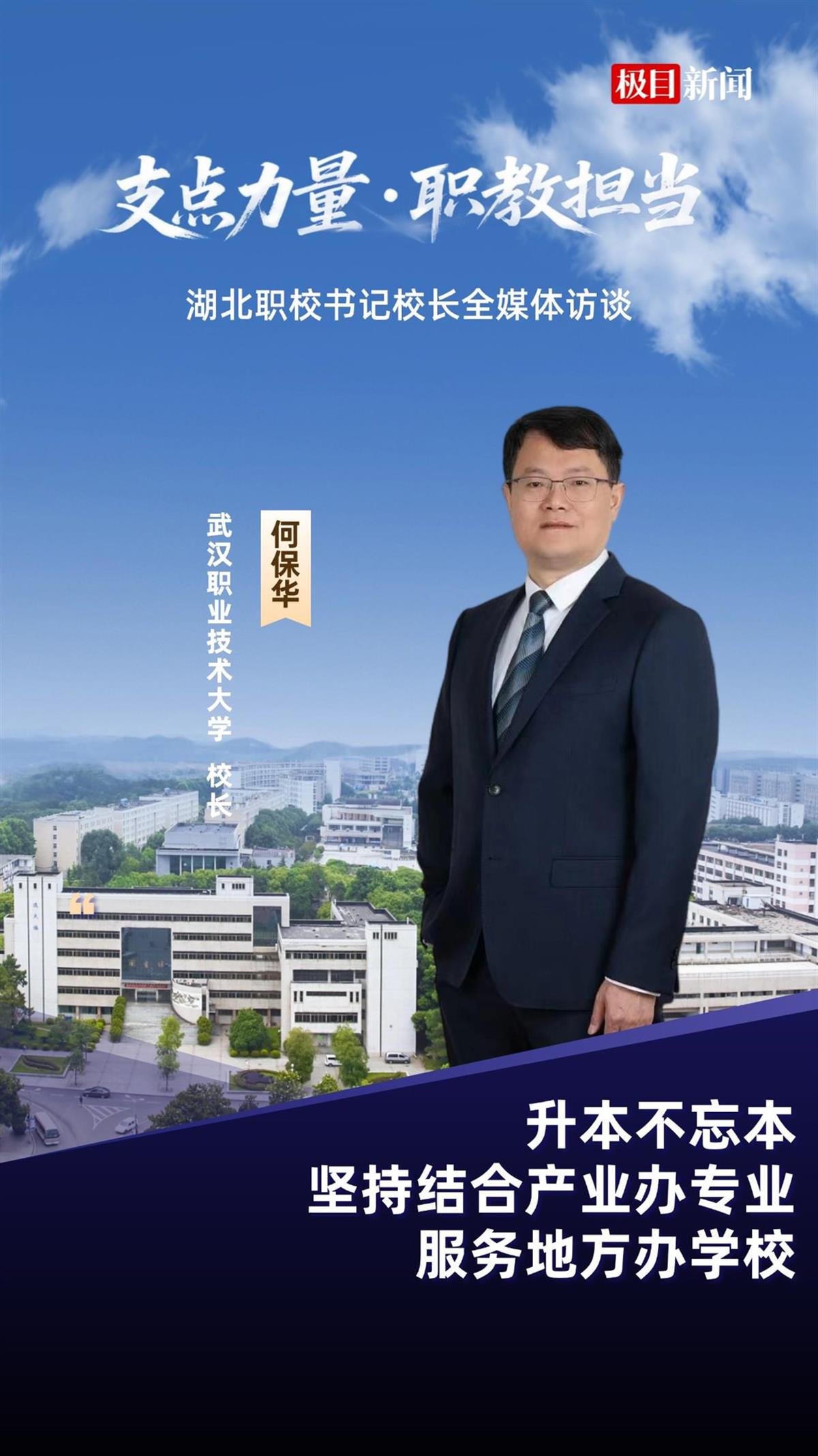主持人:极目新闻“支点力量・职教担当”湖北职校校长全媒体系列访谈,首场访谈我们有幸邀请到了武汉职业技术大学何保华校长,欢迎何校长的到来。您认为职业教育在服务湖北“建成中部地区崛起重要战略支点”中应承担怎样的责任?武汉职业技术大学是从哪些方面发力,为湖北支点建设贡献力量?