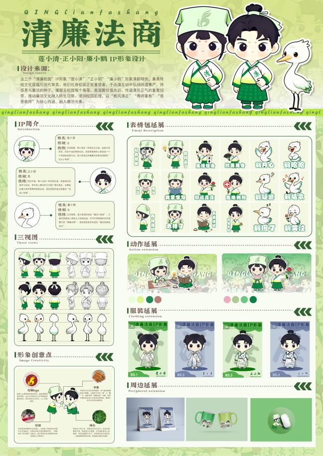 另一组获奖IP形象《莲小清·正小阳·廉小鹤》,由学生白佳丽、淡婧将“明德尚学 笃行致新”的校训精神与白鹤、书简等廉洁意象相融合,衍生出表情包、鼠标垫、水杯、台历等系列文创,让清风正气以轻松活泼的方式融入校园生活。