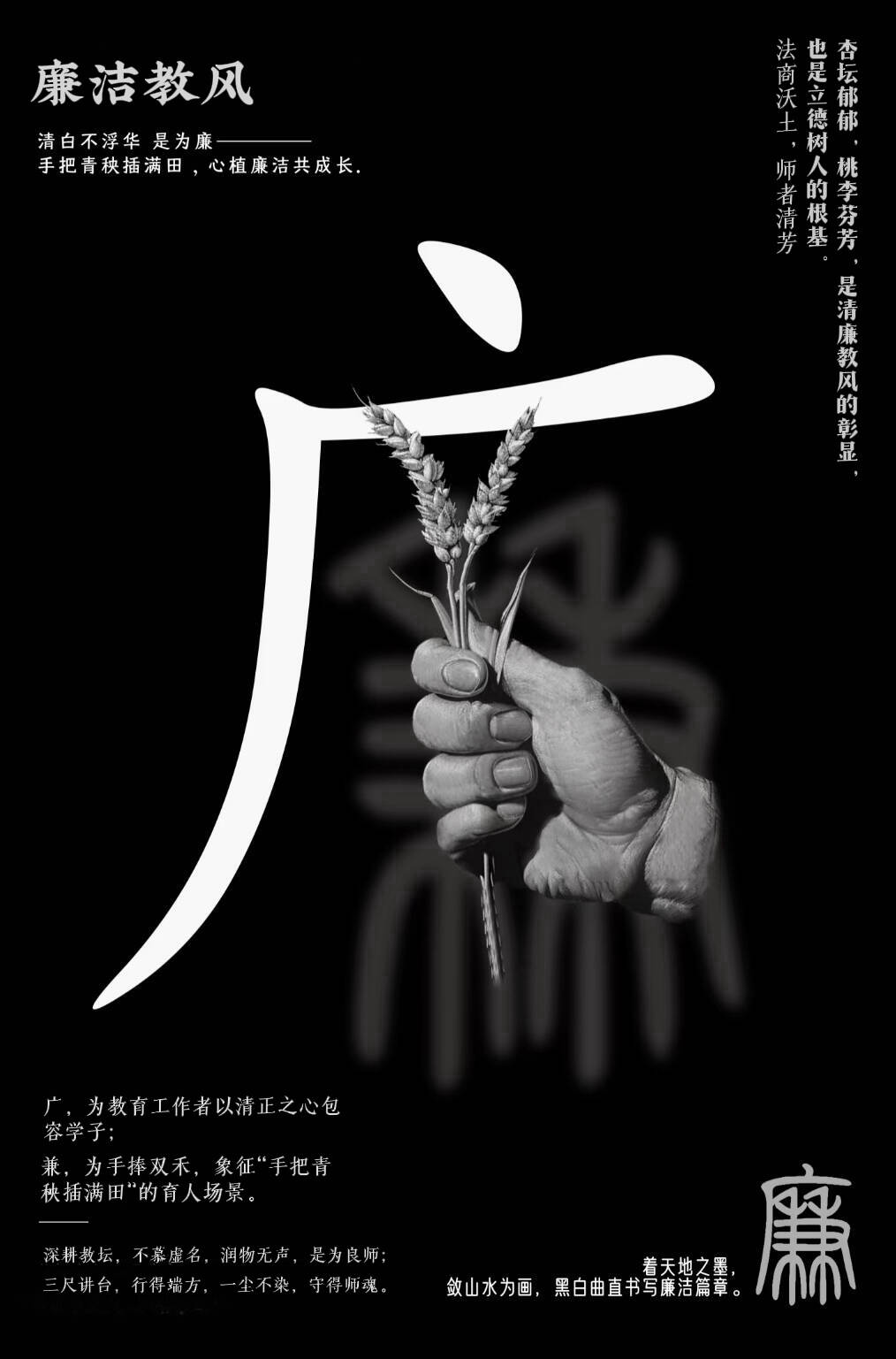 “这个设计把汉字的意境用活了!”在作品《廉洁教风》前,常有师生驻足品味。作者李若希巧妙拆解“廉”字:“广”在外为教育工作者以清正之心包容学子;“兼”在内为手握双禾插秧种苗的育人场景,蕴含了教育工作者“心怀大局、兼济天下”的道德追求。整体黑白配色,传递出一尘不染、两袖清风的清廉本色。