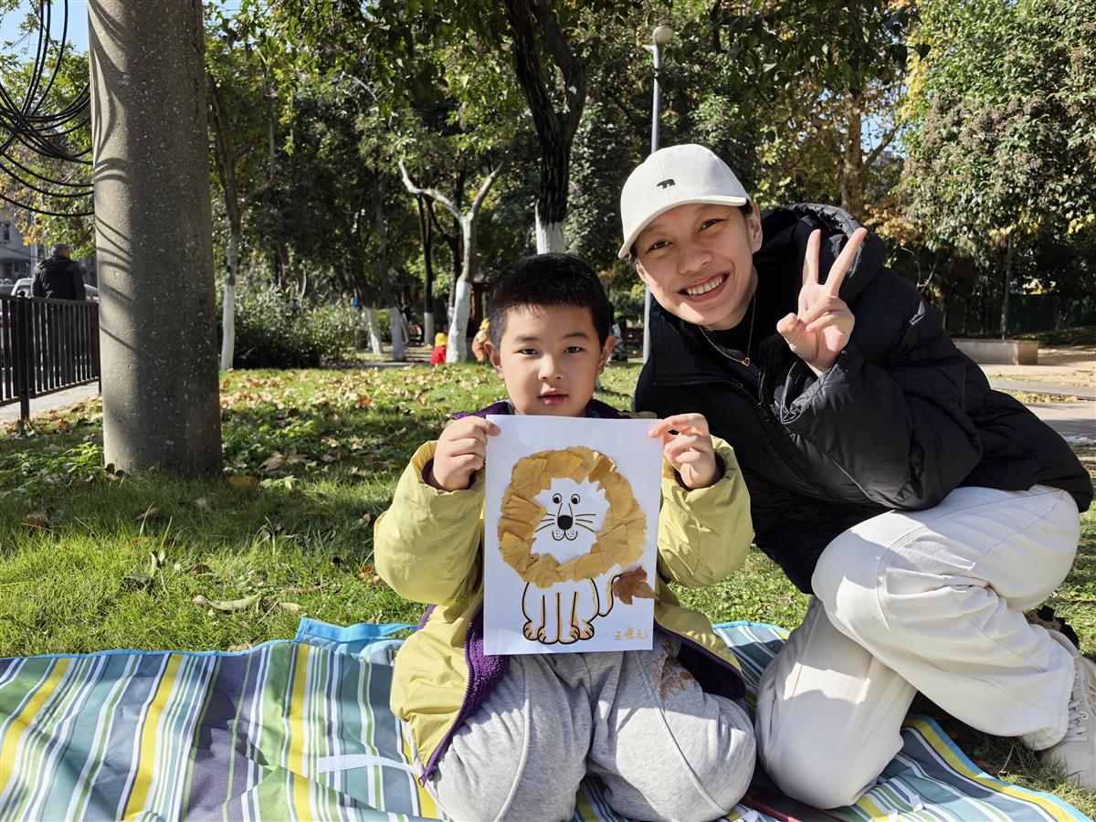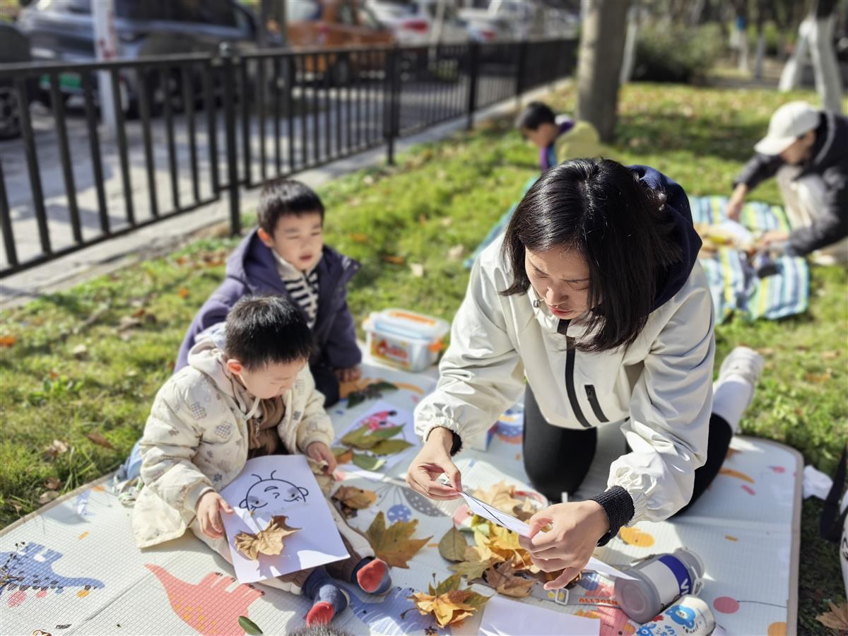 收集完自然材料,亲子自然手作环节热闹开启。孩子们围坐在一起,用落叶、树枝搭配胶水、画纸尽情创作:有的用银杏叶叠成圆滚滚的“小裙子”,给玩偶穿上秋装;有的把枫叶剪成细条,拼出“圆滚滚的小刺猬”;还有的用宽树叶当“小扇子”,配上树枝柄做成迷你扇;甚至有家庭合作,用树叶拼出了带“花边”的小帽子,往头上一戴,满是秋日的俏皮。家长们在旁协助,耐心引导孩子发挥想象,亲子合作的画面温馨又有爱。“孩子特别喜欢这种户外课程,既能亲近自然,又能动手动脑,比在家看书有趣多了!”参与活动的家长点赞道。
