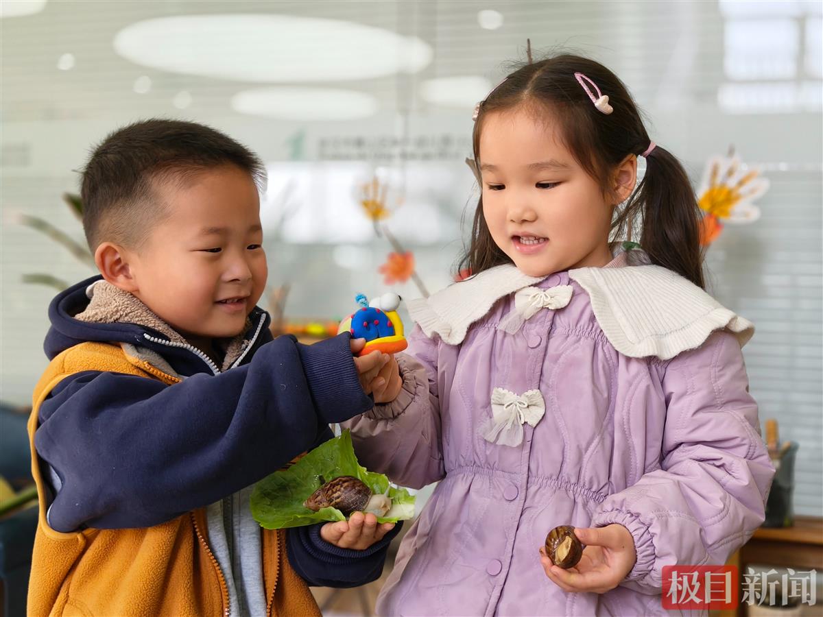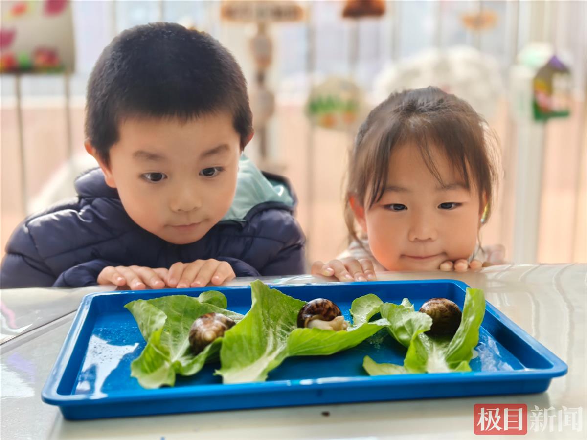“老师,蜗牛今天怎么不动啦?是不是冷了?”“它吃了我带的菜叶,它的壳好像变亮了一点!”近日,武汉市青山区第一幼儿园白羊佳苑园中一班的自然角格外热闹,十几只小蜗牛成为孩子们的“新伙伴”,一场充满童趣的生命教育实践活动在此展开。