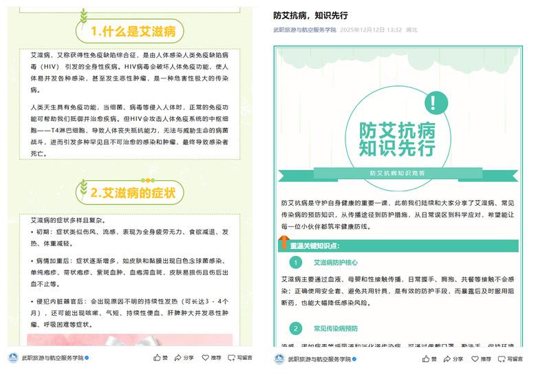 除了线下精准授课,线上宣传同样多点开花,以趣味形式拓宽传播维度。12月1日起,旅航学院微信公众号打造“防艾知识云课堂”,成为线上宣教第二阵地。每日推送的科普推文采用“图片+文字”形式,既涵盖“艾滋病与性病的区别”“日常接触不会传染的科学依据”等硬核知识,也收录“抗艾志愿者故事”“反歧视公益宣言”等人文内容,兼顾科学性与感染力。
