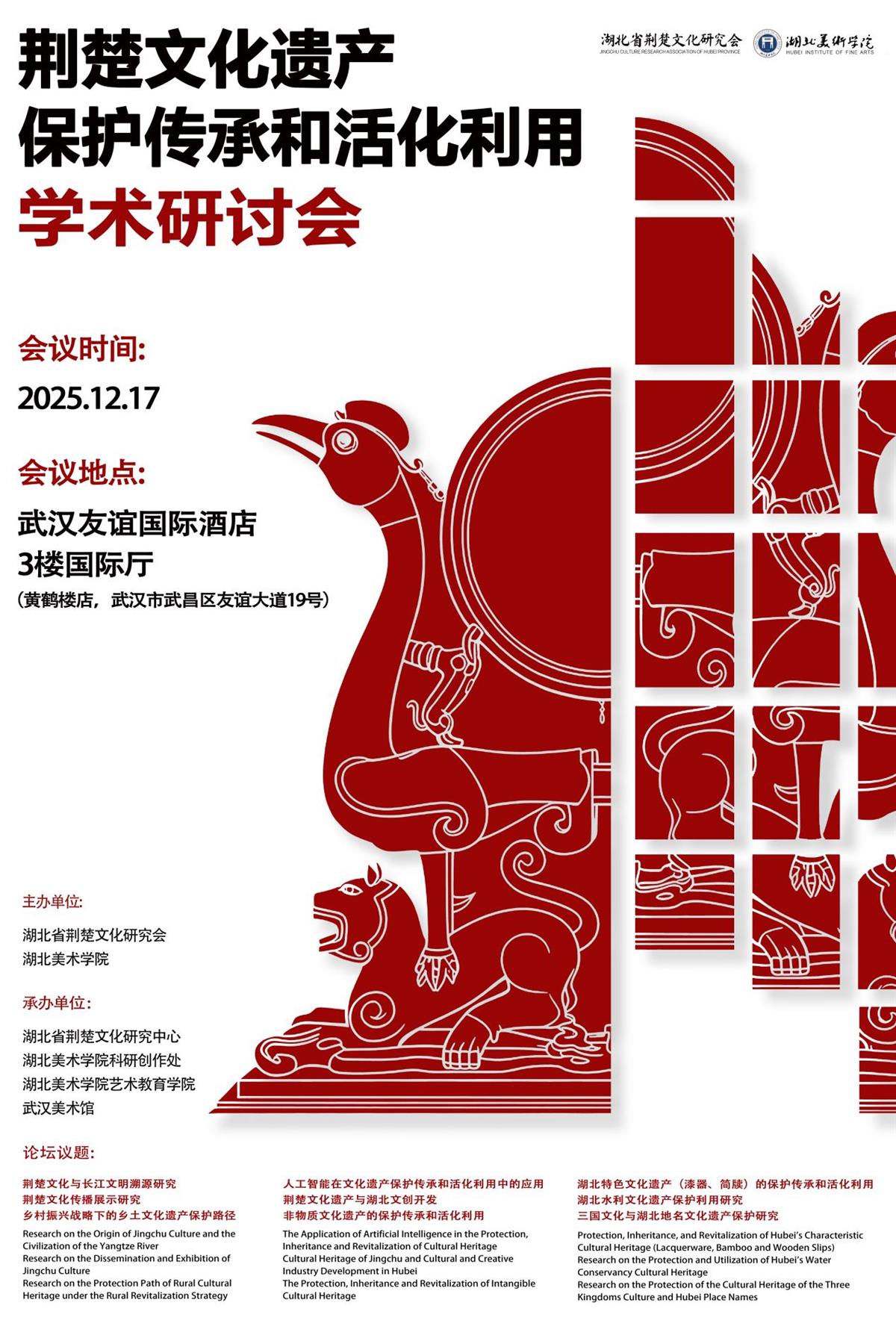 12月17日,由湖北省荆楚文化研究会与湖北美术学院联合主办,湖北省荆楚文化研究中心、湖北美术学院科研创作处、湖北美术学院艺术教育学院、武汉美术馆共同承办的“荆楚文化遗产保护传承和活化利用”学术研讨会在武汉举办。来自湖北省内近30所高校和机构的百余位专家学者齐聚江城,围绕文化遗产的保护策略、传承路径与创新实践展开深度交流,共谋文化发展新篇章。
