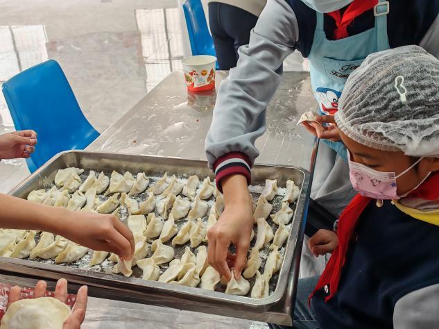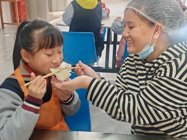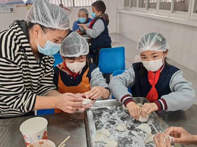 同学们学得专注,包出的饺子形态各异却满含童趣,有的像小巧的月牙,有的像圆滚滚的元宝,还有的歪歪扭扭,逗得大家哈哈大笑。孩子们的欢呼声、嬉笑声此起彼伏,指尖翻飞间,空气中鲜香与欢笑交织。
