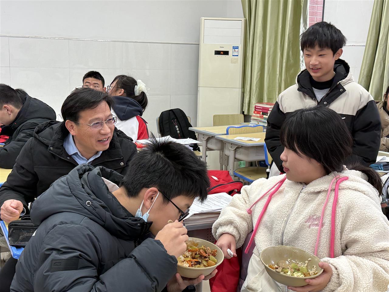 12月23日中午12:00,武汉市光谷左岭第一初级中学(下文简称“左岭一初”)校长刘书亚走进807班陪餐。和学生们一起吃着萝卜排骨、莴苣肉丝、肉末蒸蛋、肉丝粉丝汤等,他边收集大家对饭菜的意见,边鼓励他们以班为单位拟定一周菜单。