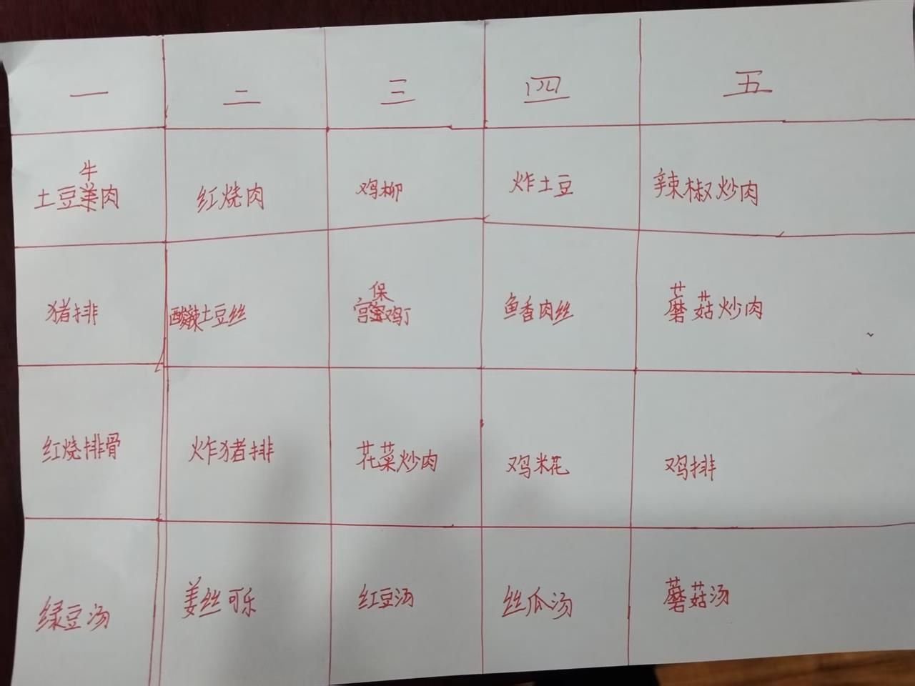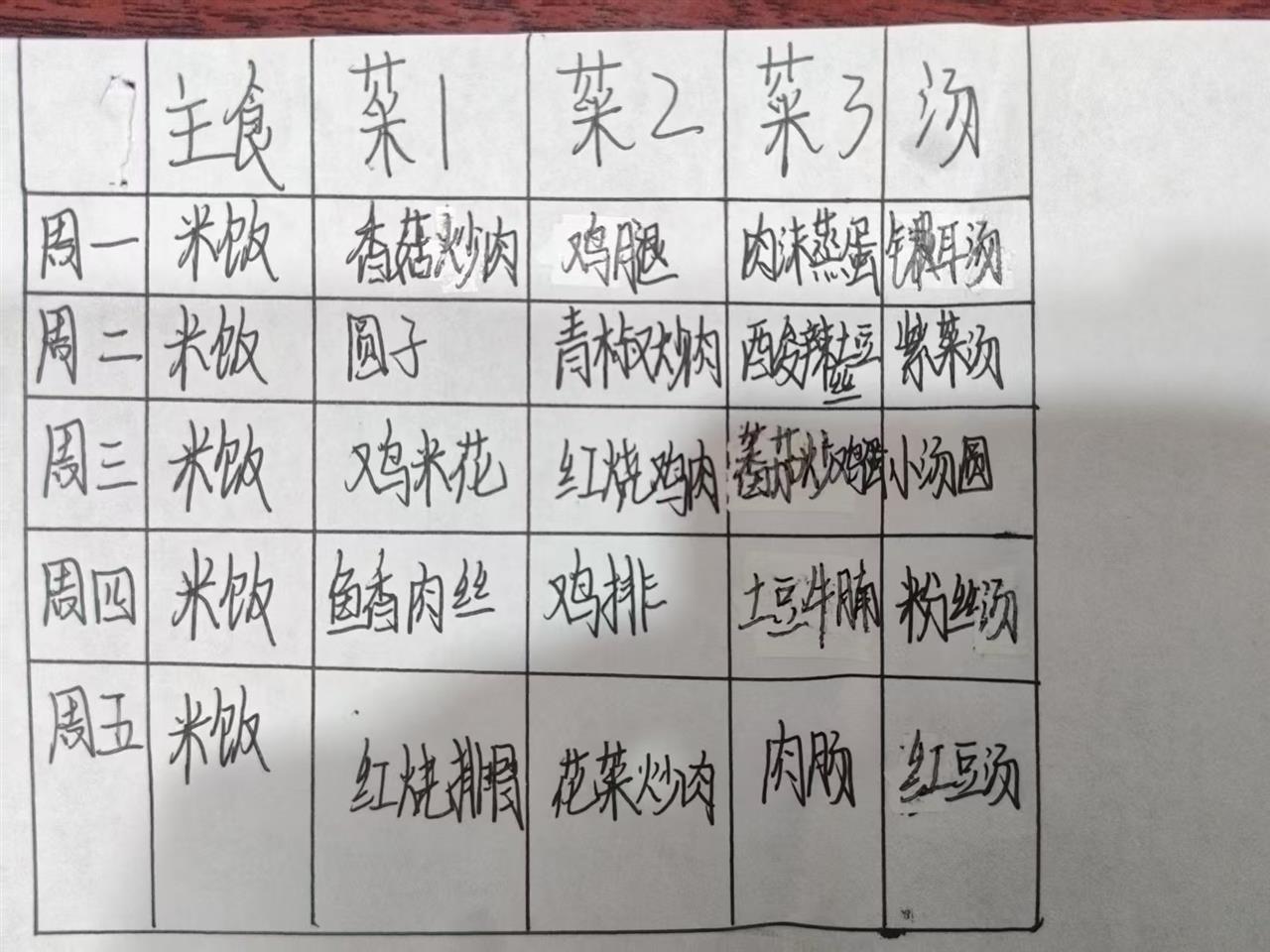705班、901班都拟定过一周菜单
