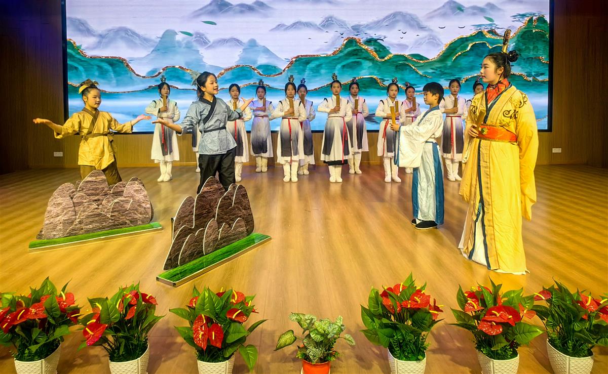 比赛间隙,学生们带来精彩才艺展示:鼓乐《大鼓串烧》气势铿锵,舞蹈《绽放》洋溢童年朝气,情景剧《回车埠的故事》将“孔子使子路问津”等历史场景生动再现,让“君子博学而日参省乎己”的哲理可视可感。演出不仅展现学生风采,更折射出学校“新三好”育人的丰硕成果。