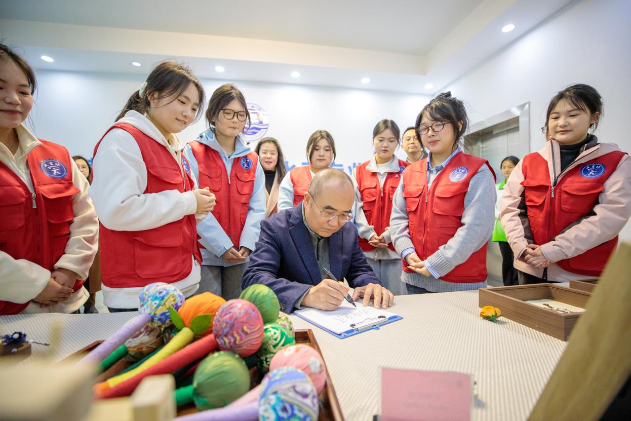 报告会结束后,张定宇参观了学生中医药文创作品。得知他通过中医推拿治疗渐冻症,已能重新骑自行车,学生们深受鼓舞,并请他题词勉励。张定宇欣然写下“为中医药文化共同努力”,现场响起热烈掌声。